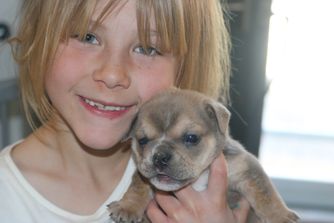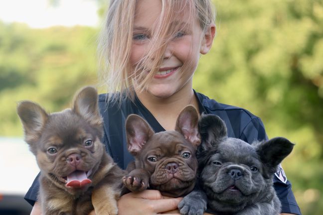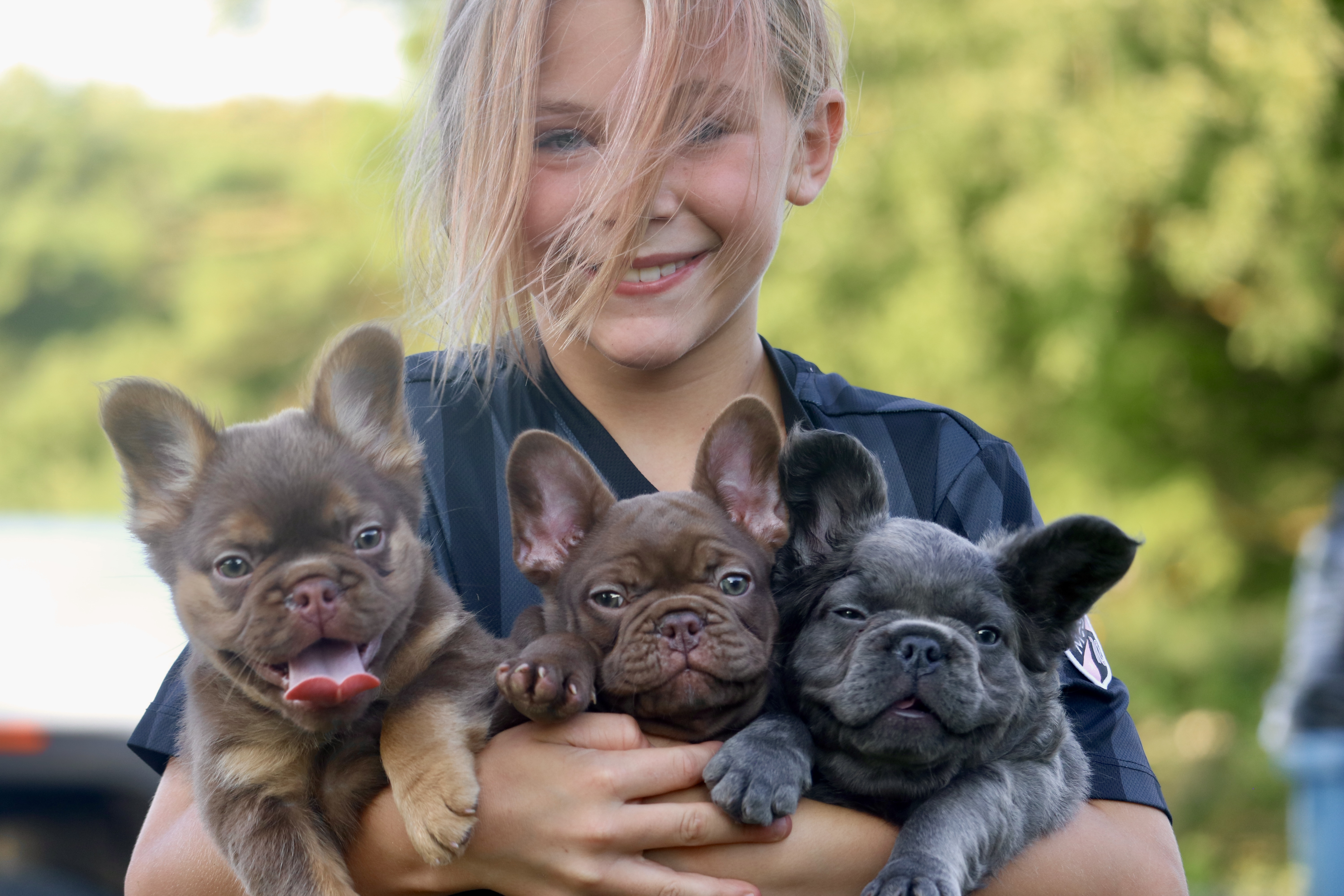 Our Bulldog puppies include chocolate tri-color, lilac tri-color, blue tri-color, black tri-color, and fawn. French Bulldog puppies include tricolors, black and tan, black, blue fawn, and blue. Colors will vary depending on the parent dogs.