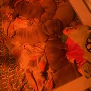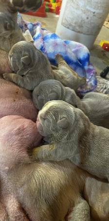 6 weeks old today! They have their first vaccine this am and got to go outside for about 10 mins. We are in a heat advisory so they might not get anymore outdoor time till it’s cooled off at night. They are very playful and doing great with litter training.