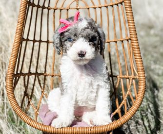 Teeter is a mini Merle Goldendoodle weighing in at 23lbs with beautiful bright blue and marble eyes:) She is very loving and so gentle and sweet. She loves to cuddle and run around in her big back yard:) She is great with kids and other dogs and puts out amazing teddy bear puppies:) She is likely our best mom ever:)