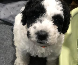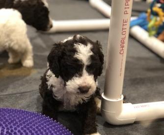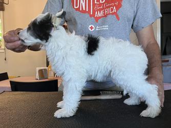 Our Chinese Crested puppies include white, sable, and black and white. Spanish Water Dog puppies include white and black, brown and white, and black and white. Colors will vary depending on the parent dogs.