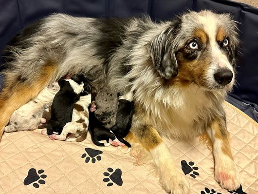 Our puppies include brown and white, blue merle, red merle, black phantom, black and white, black tri-color, red phantom, and red tri-color. Colors will vary depending on the parent dogs.