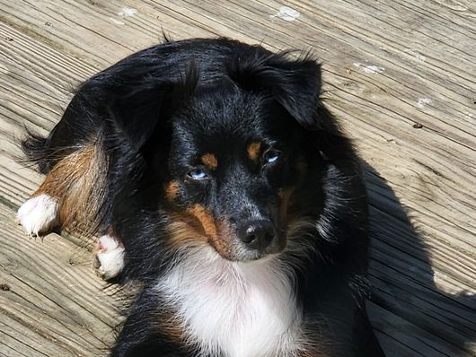 Fly is my goofy, silly boy. I don't think he'll ever grow out of his puppy stage! He's always up for a game of fetch, tug or just sitting in the porch swing with me. He loves everyone he meets, car rides and swimming in the lake. He just loves life! Fly's pups inherit his beautiful disposition and gorgeous head. He has given me several show quality puppies as well. I've kept back two of his kids for my program (Smokey and Valley). He is full panel clear for the entire Embark aussie health panel.