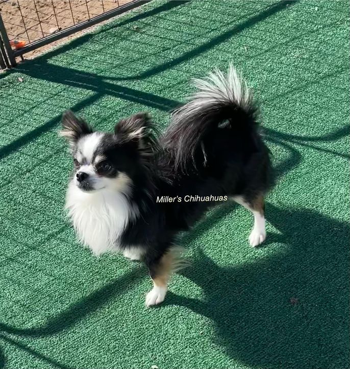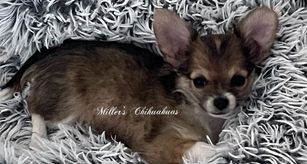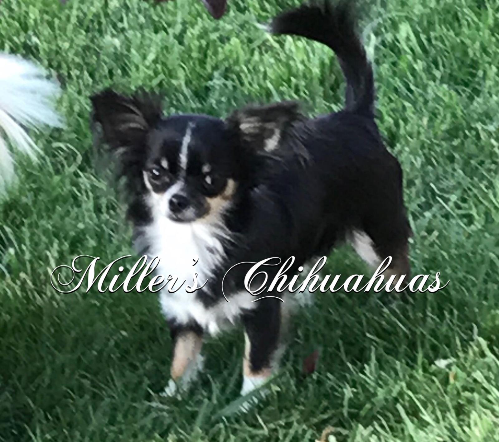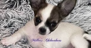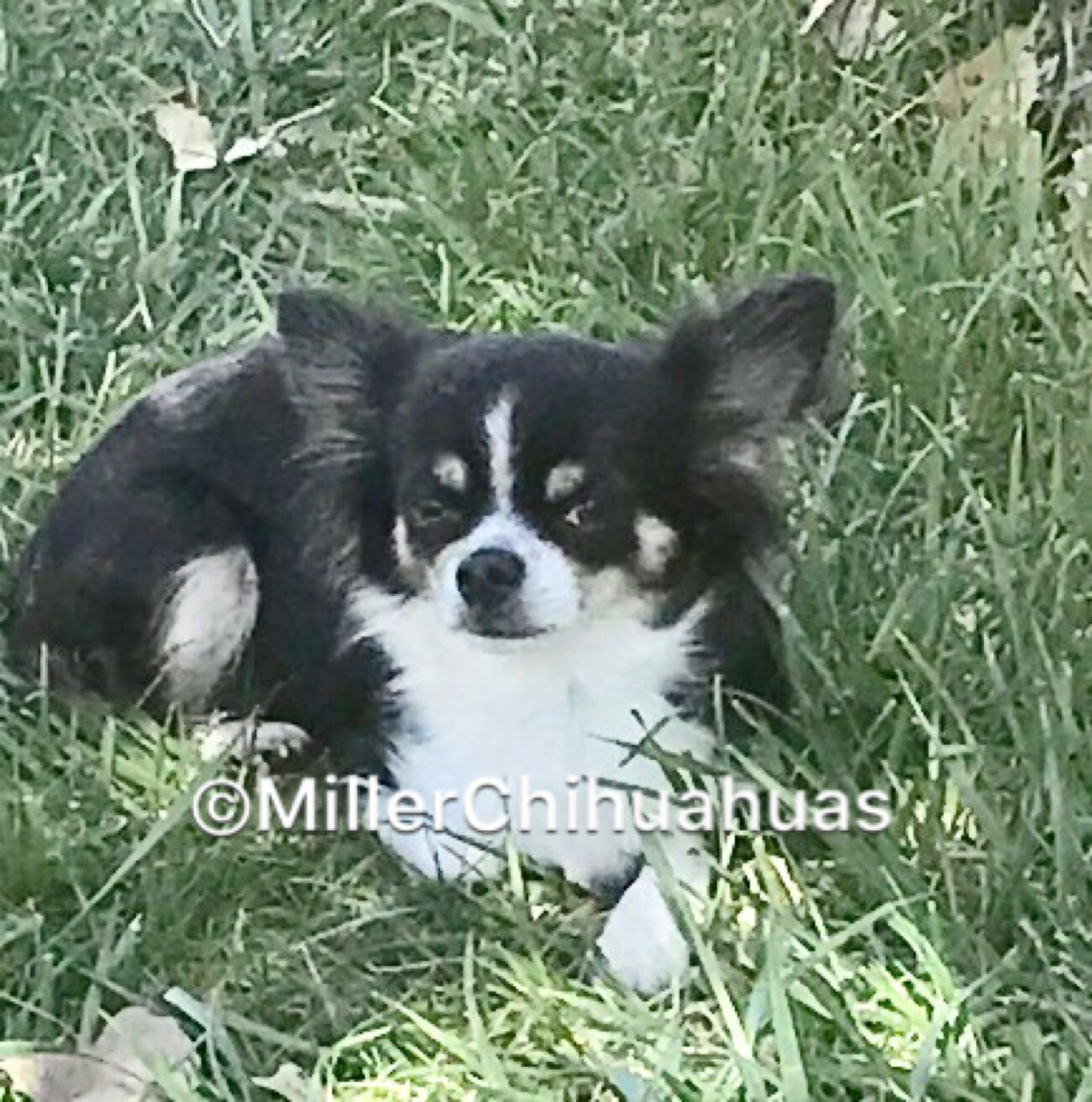 Millers Chihuahuas were wonderful to work with. Once Ace arrived I suddenly had a lot of questions and Celia was very patient in answering all of them. Ace is a very smart boy, so training is easier than I thought. He's very sweet and loving most of the time. His spots on his back form a heart. I feel fortunate to have received Ace Miller's Chihuahua as my pet.