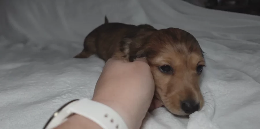 Our sweet red longhaired miniature Dachshund mama is AKC registered and loves her humans. She was raised in our home and is very much part of the family. She adores cuddles, loves going for walks, and is always excited for a ride on the mower or in the Jeep. She’s calm, affectionate, and wonderful with people—truly the definition of a loyal little shadow.