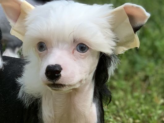 Gemma is a female Chinese Crested 4 weeks old. Carefully selected as a great representative of her breed, Mindy decided to make her part of their program. Mindy has passed Good Dog’s screening process, which involved a review of their breeding practices, environment, and the mental and physical health of their dogs.