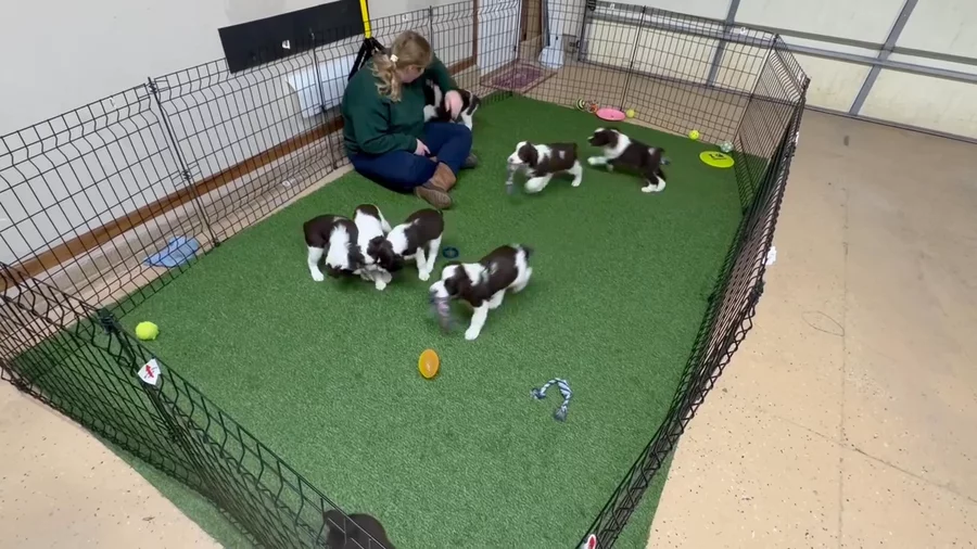 More updates in order by age: getting bigger! Highlighters included here: * Movie night snuggles * snapped a few photos of the litter with a new blanket January 2025 (snowflakes) * Video included- this was the first time we were working on exposure therapy with things that could startle the pups/desensitization to lights/sounds/textures (ie baby toys) Enjoy! https://my.gooddog.com/mindys-english-springer-spaniels-south-dakota