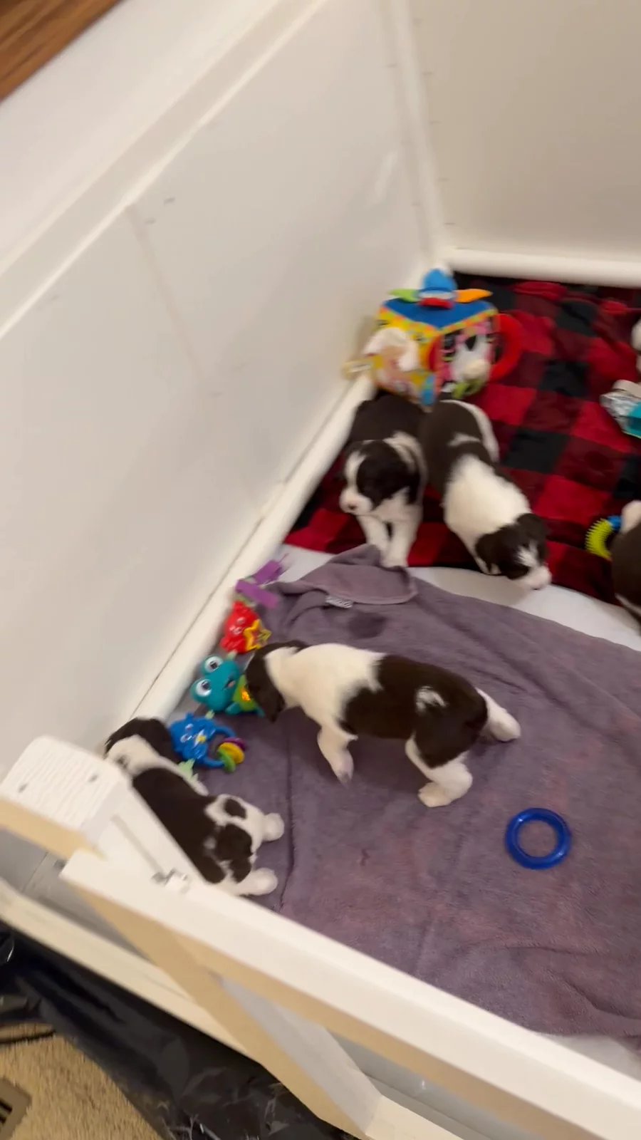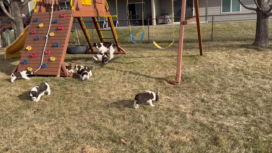This is what we have been up to lately- many trips to the great outdoors (but with that the pups are keeping the box inside fairly clean overall, so early potty training is going pretty well!!) We load everyone up in totes to navigate the stairs on the deck and then they go do their “routine” and run & play. They seem to really enjoy being outside, especially on the warmer days. Not much snow right now, so that helps quite a bit. On the colder days, outside trips are quick, and then the pups go burn their extra energy in the garage pen before coming back in for nap time. Including a few cute videos of bouncing and pouncing springers 🐾 learning to play with their siblings. https://my.gooddog.com/mindys-english-springer-spaniels-south-dakota
