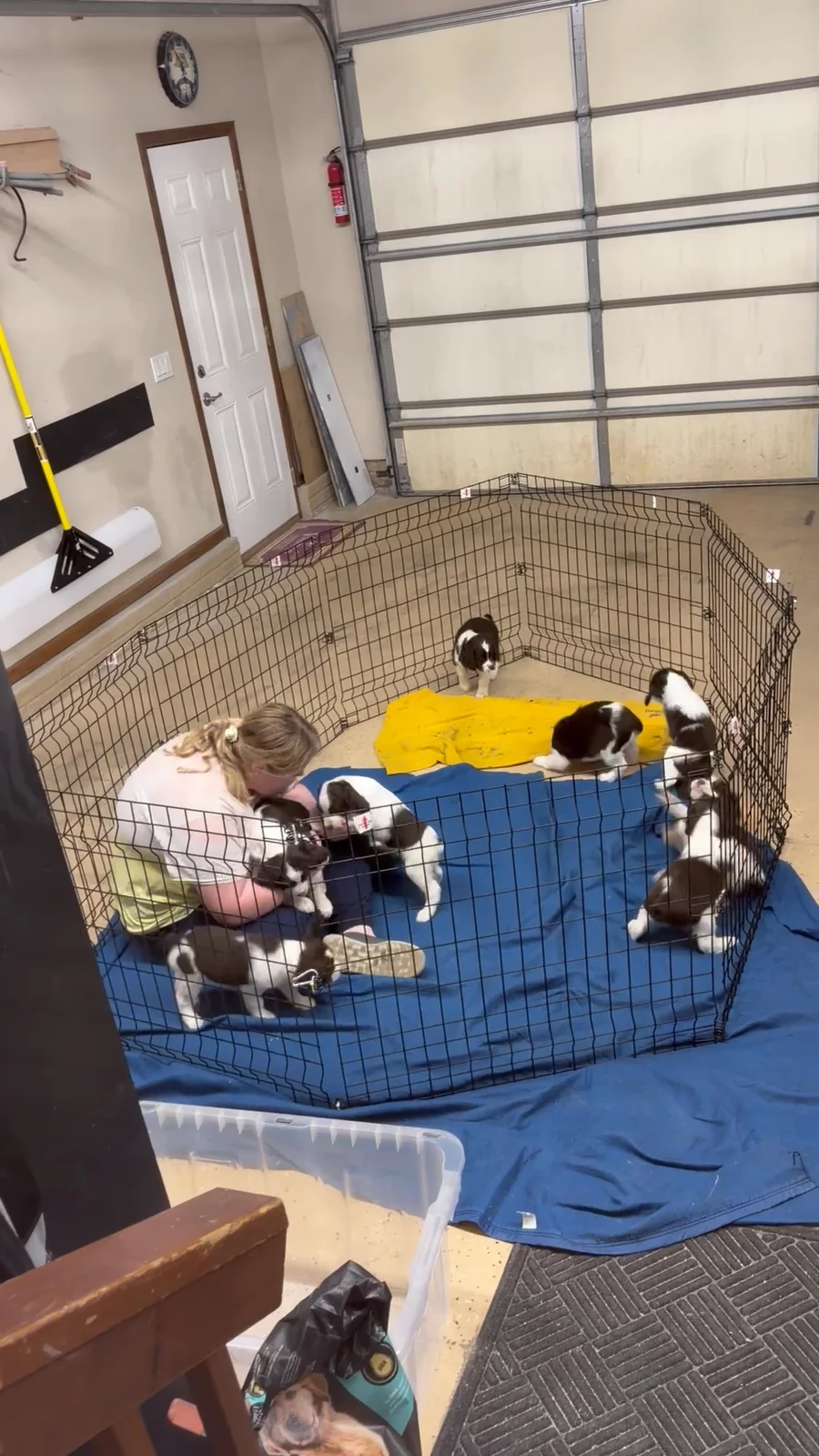 Good Morning everyone- hope you’re all staying warm! Right now in SD it's - 7 and has been chilly this week. The pups have been troopers despite the cold/snow/ice we’ve had to navigate this week (although I think the adults are ready for the warmer temps again-ha!) Since the weather has been a factor this week, we adapted a bit too. Highlights: *everyone is getting bigger, more playful, and, really starting to show their personalities *I am not quite sure who has who potty trained but we have had a great week and they are really getting the hang of it, and keeping the box/tray with pad fairly clean and waiting to go outside. (I am still counting it a win) *We expanded the heated garage play pen so they can run and get their "puppy wiggles" out despite the cold. Nala (mom) was interested in too so joined the fun and it appears she is still teaching the babies some valuable lessons. In the photos, my hubby was helping the pups get used to the new pen and play with them- but I think he was a little tired then they all came to lay by him (super cute). My kiddos have been a great helpers too. *After the pups get their "puppy wiggles" out, then it's cuddle and nap time. Enjoy the pictures and videos! https://my.gooddog.com/mindys-english-springer-spaniels-south-dakota