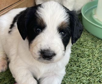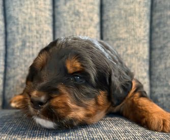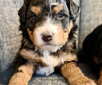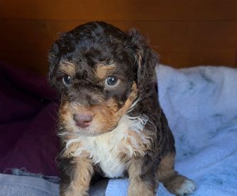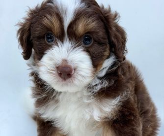 Brownie is an F1b male tri aussiedoodle with a fully furnished coat. He loves everyone and knows no stranger. He's about 17lbs and knee high 16'. He's a great dog and we are excited to breed him to make multigenerational aussiedoodles.
