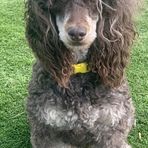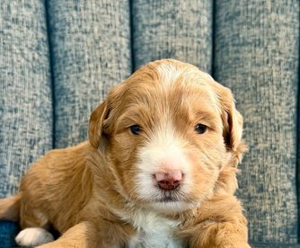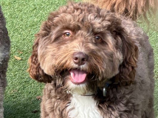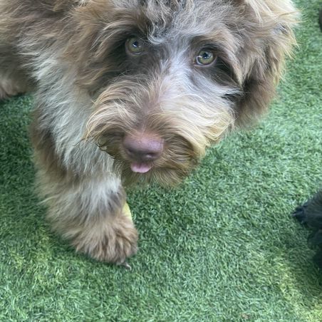 Albie is an f1 aussiedoodle. He's about 15lbs. He had the best personality. Loves all dogs, loves kids, and has a great knows no stranger. His brown is staying dark, and he has a wonderful coat.