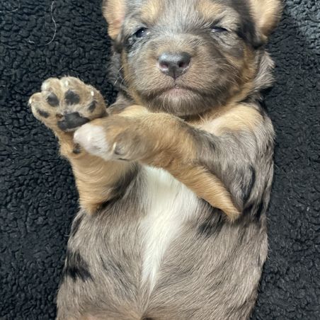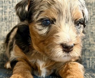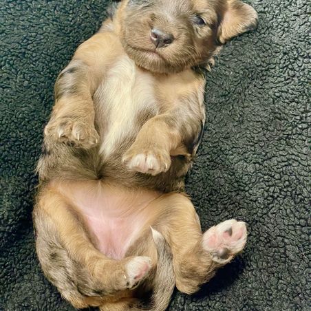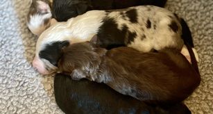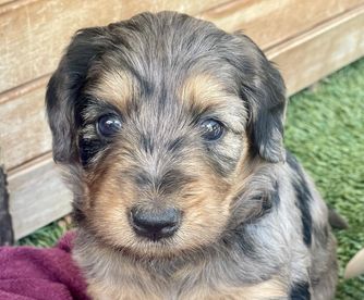 Our Aussiedoodle puppies include apricot, blue merle, red merle, black and white, black tri-color, red phantom, and red tri-color. Colors will vary depending on the parent dogs.