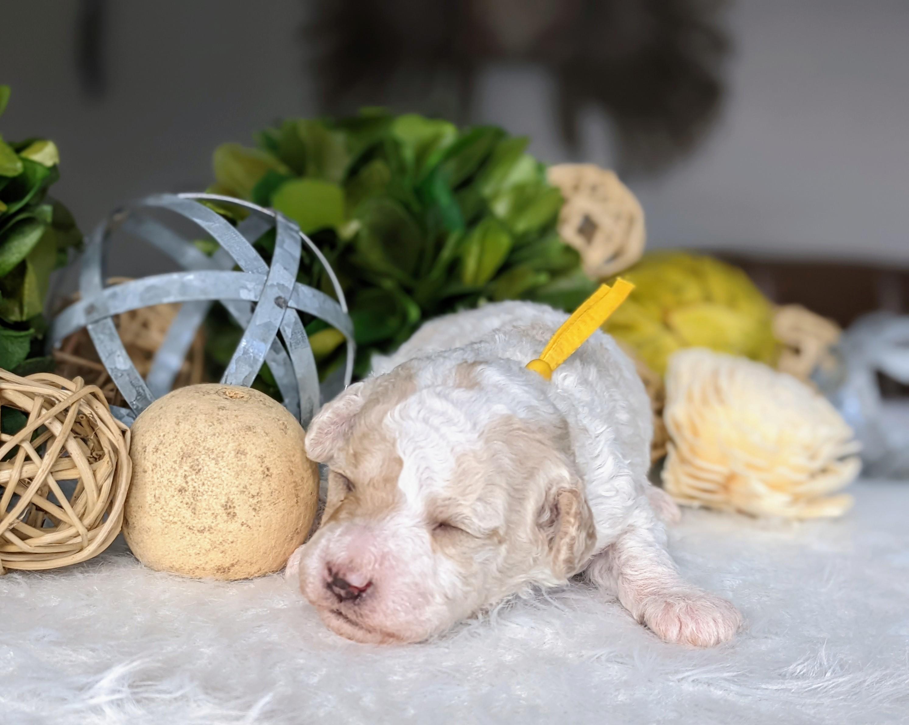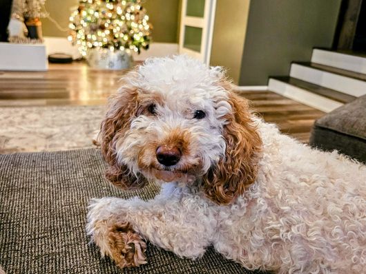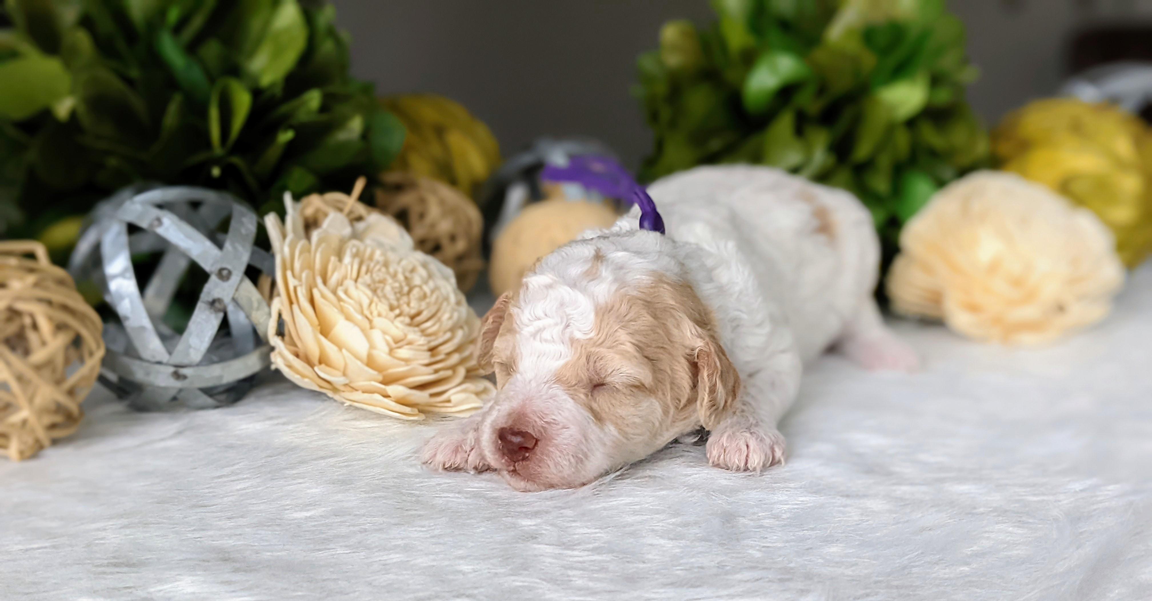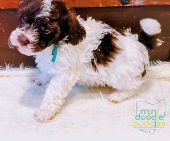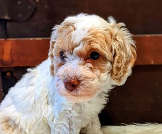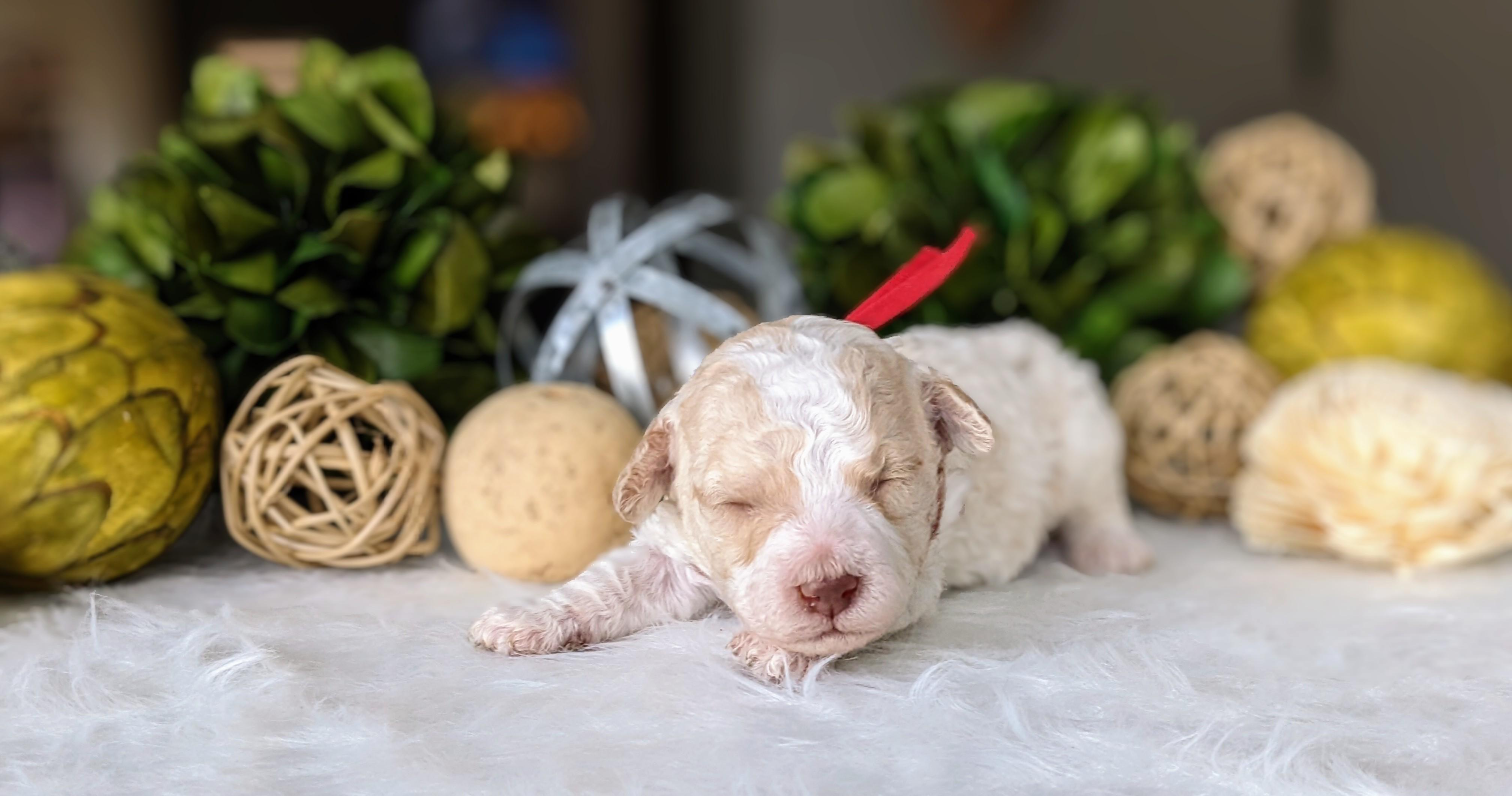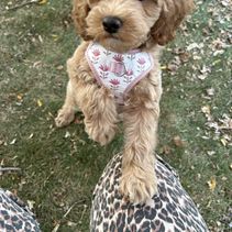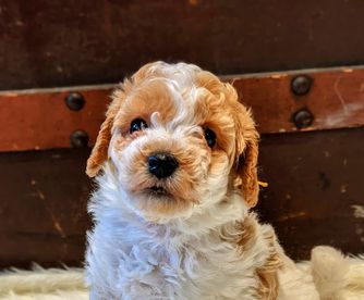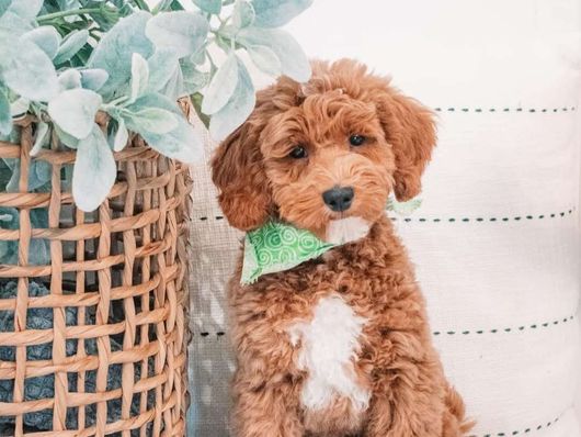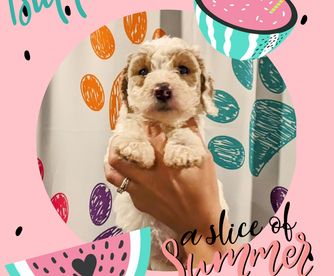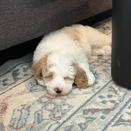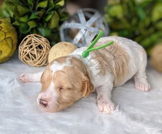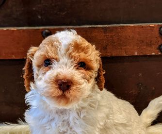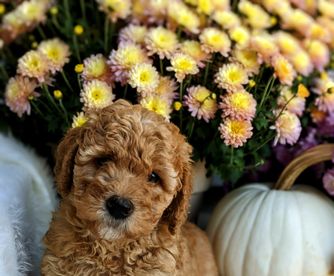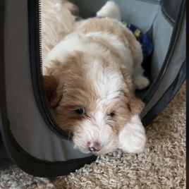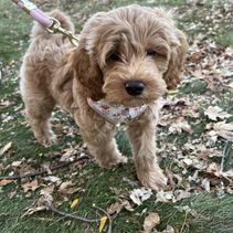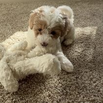 Our Daisy girl is what got all of this started! She is from sunny Florida and now lives in snowy Ohio! She is our red and white parti petite goldendoodle weighing in at only 13lbs. Her hair is curly and does not shed. She's so laid back and such a cuddle bug!
