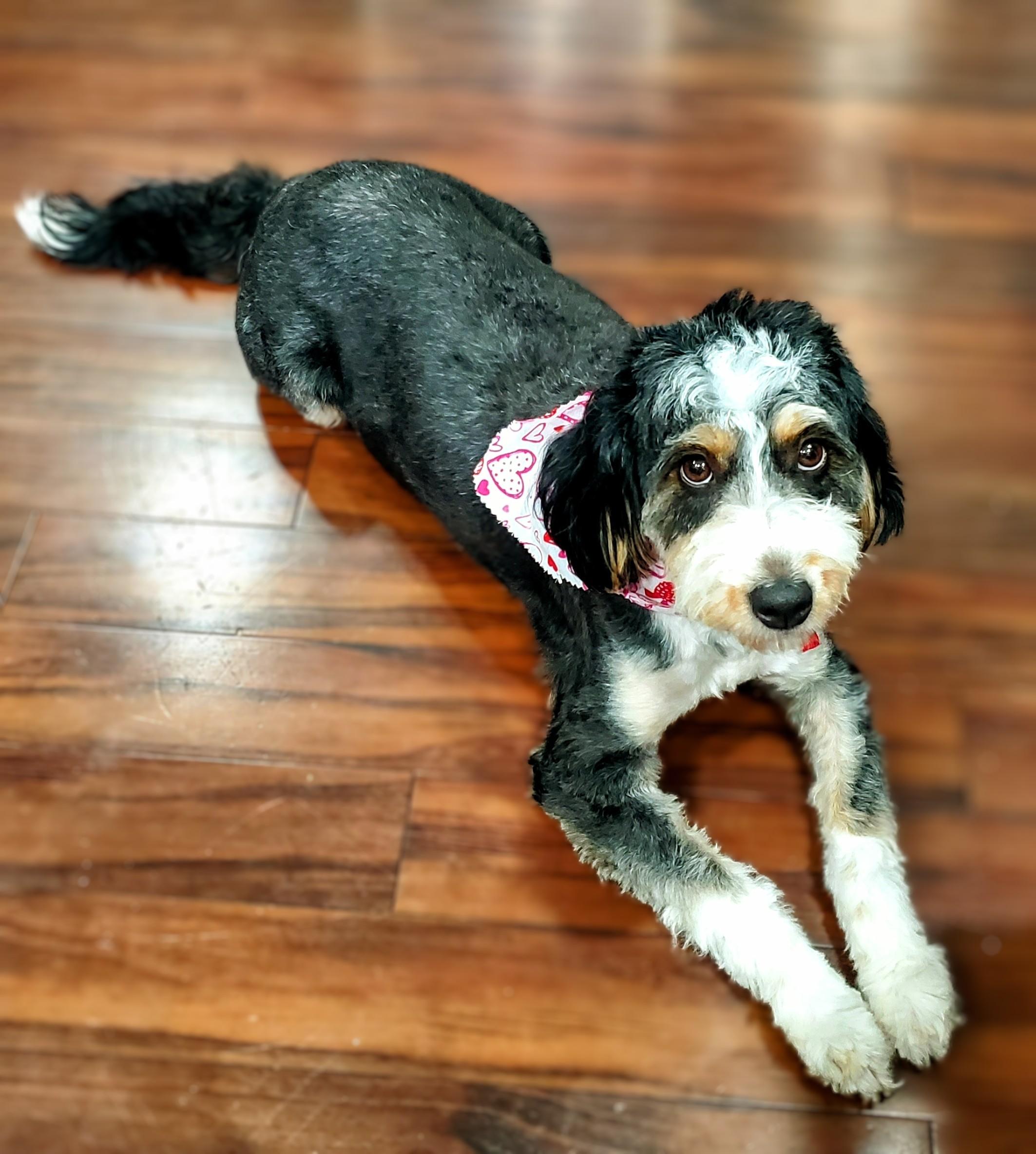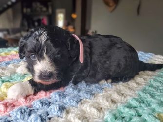 Raven is our Tri colored mini bernedoodle. She has the personality of a gem. She is always looking for a.hand to pet her. She's so laid back and just goes with the flow. She is 100% a lap dog and always has to be with someone! She's our litter ravey baby!