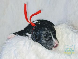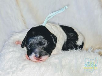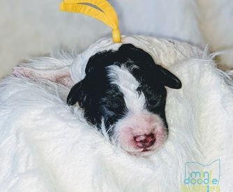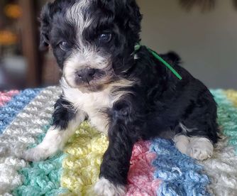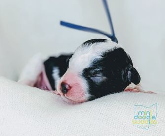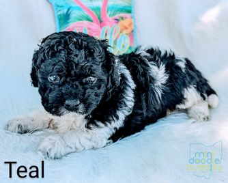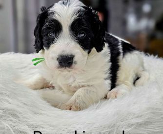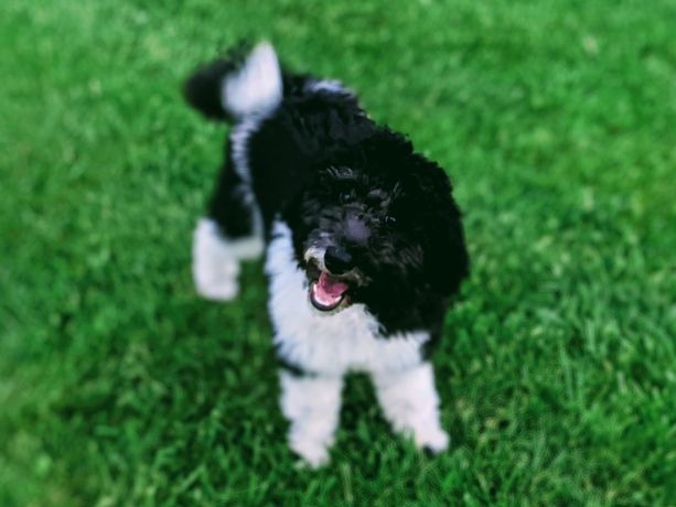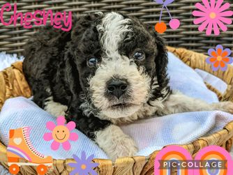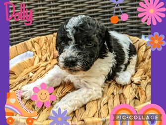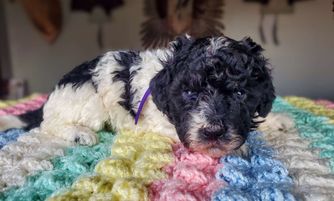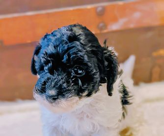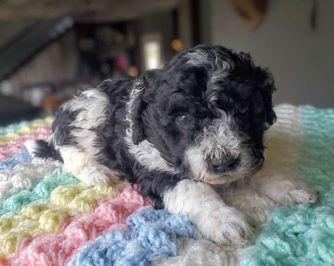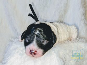 Tesla is our black and white parti mini goldendoodle. She is full of energy and always wanting to play! Her coat is absolutely gorgeous and so shiny! She's a keeper!