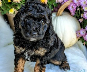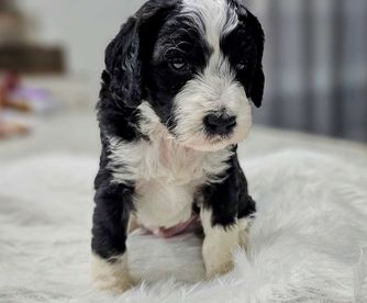 Our Bernedoodle puppies include sable, black, black and white, tri-color, phantom, and merle. Goldendoodle puppies include cream, apricot, red, chocolate, black, phantom, merle, and parti. Colors will vary depending on the parent dogs.