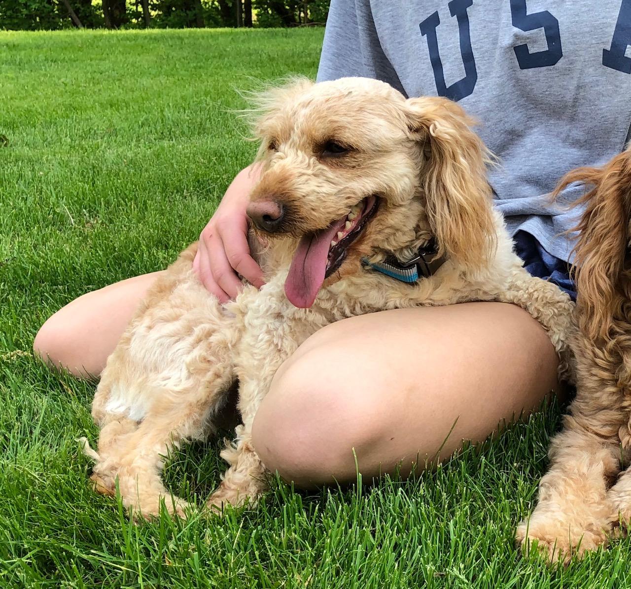 Emmy is very calm and super sweet. She is an F1 miniature goldendoodle and weighs 28 lbs. She loves to be around everyone and everybody loves her! She has a wavy low shedding coat.