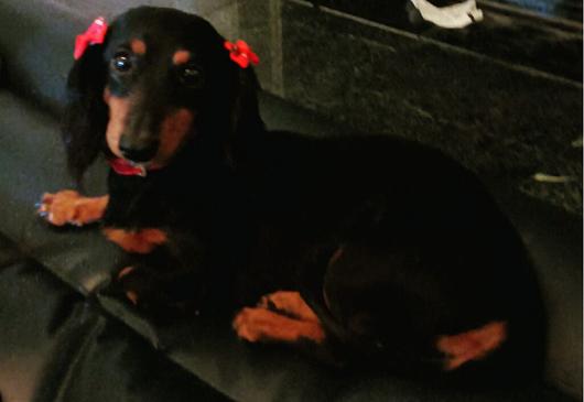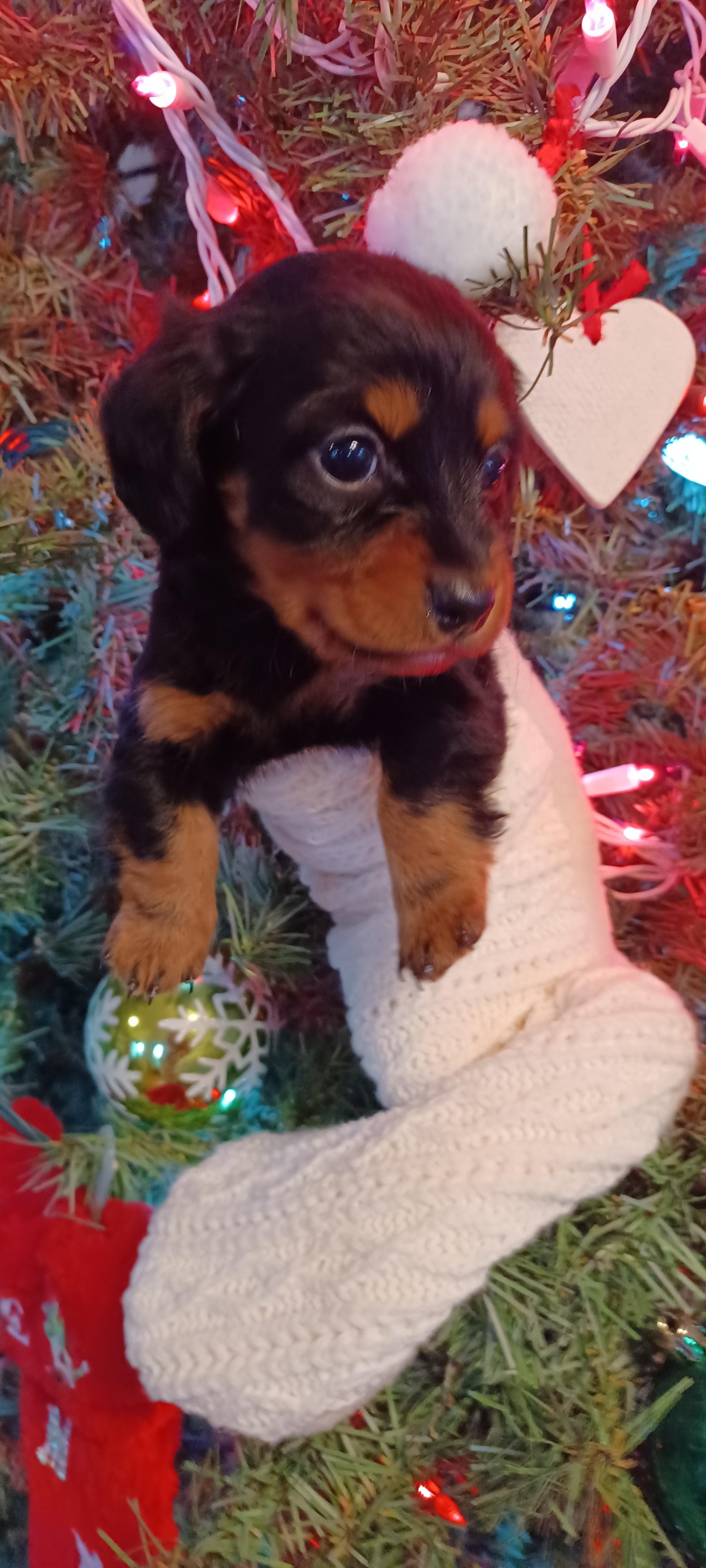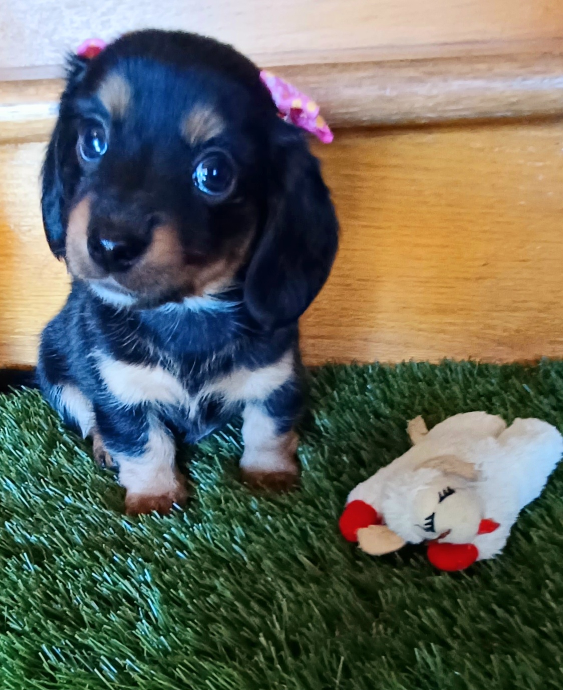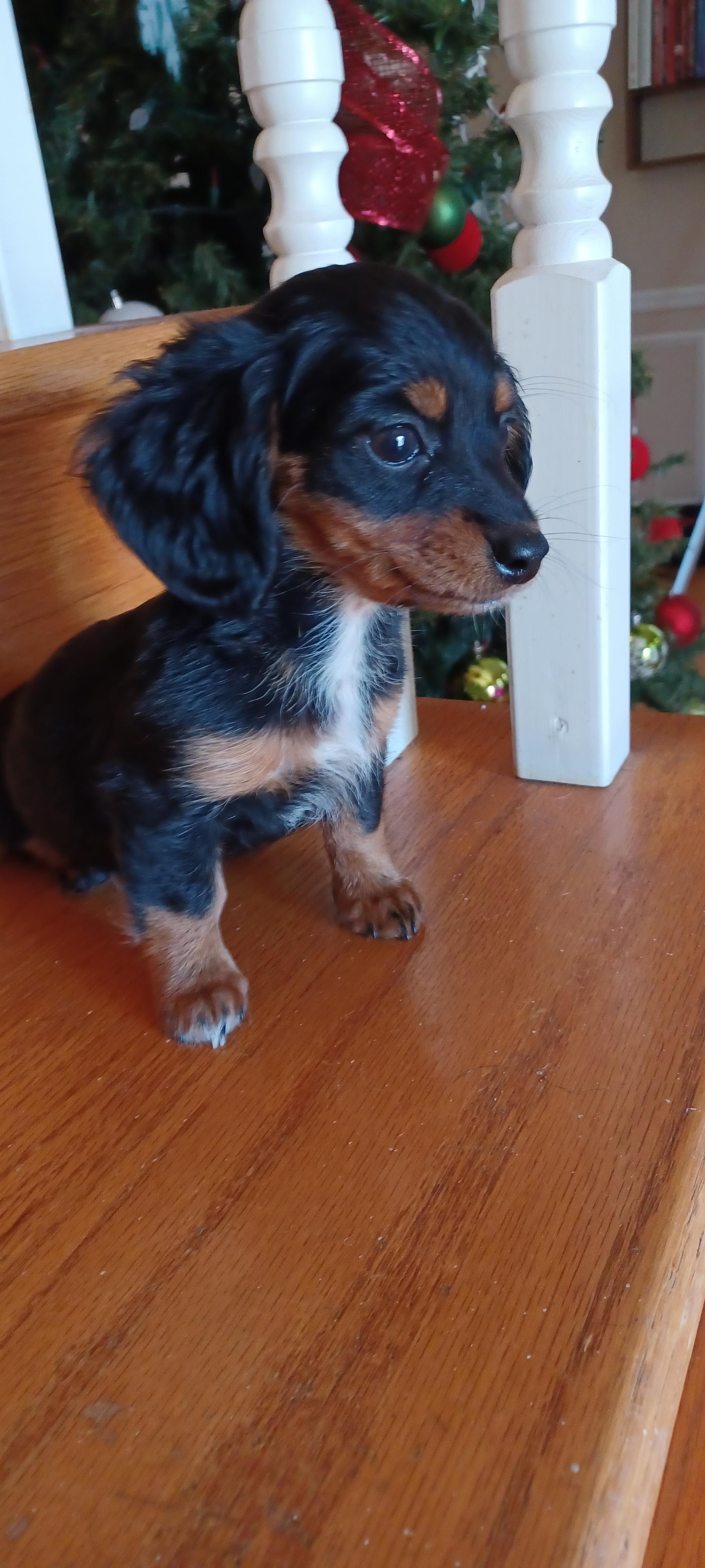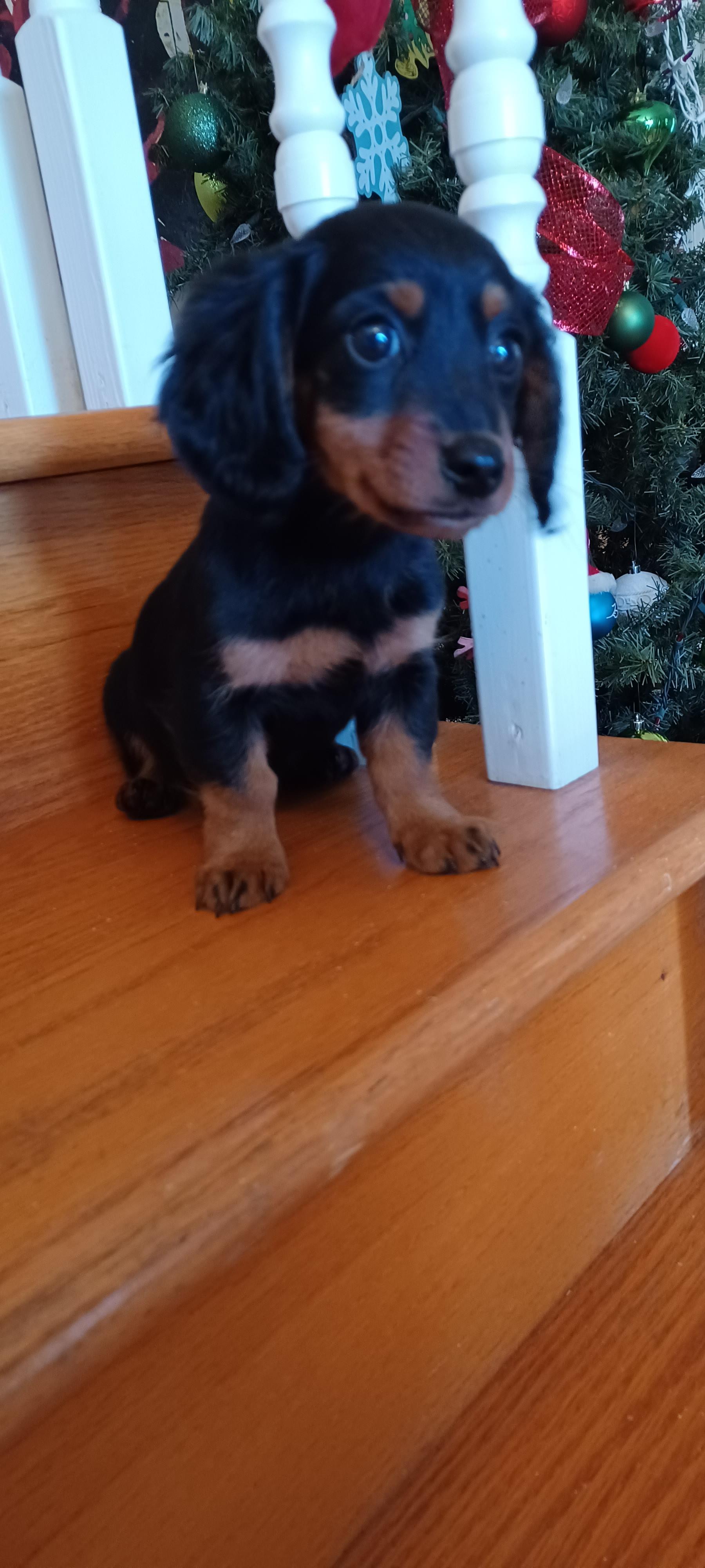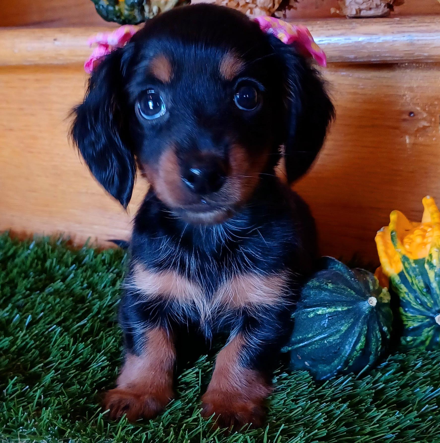She's a miniature Longhaired Dachshund with a black & tan coat🥰