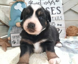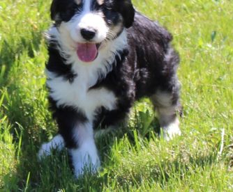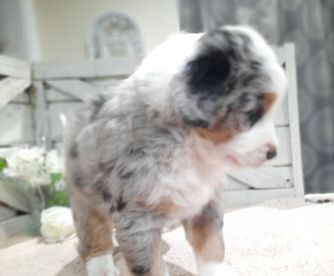 Milo is a happy go lucky, incredibly charming, very handsome stud who is very affectionate and loves all people. Whenever I look into his face my heart melts, we have been blessed with some awesome Aussies. He is a joy to have around, has never been sick and has his forever home at our farm. He is a fast learner and loves to go for walks. Milo also loves to hang out with his favorite female doggy friend Raven. We have a great boarding facility in our area where the dogs can get together during the day in a large pasture, Milo enjoys playing and making friends there.