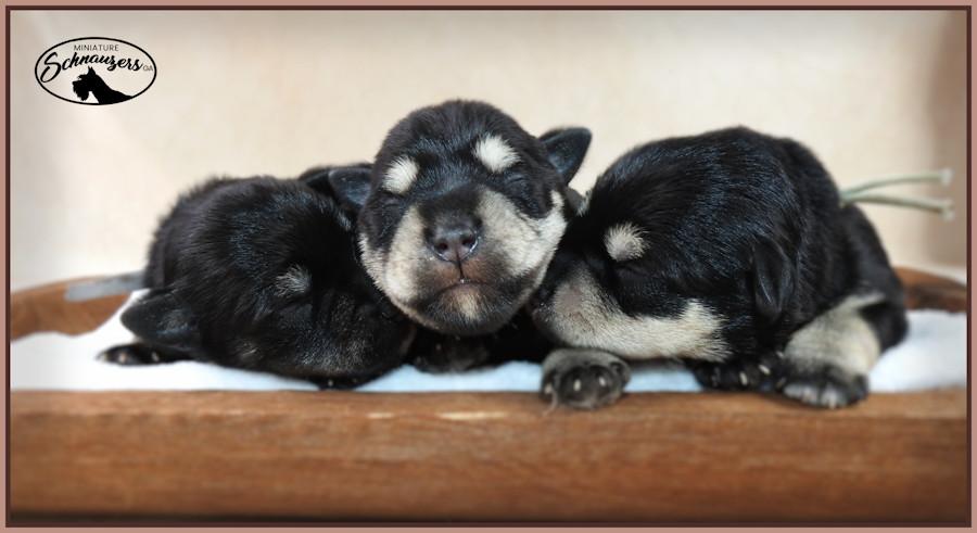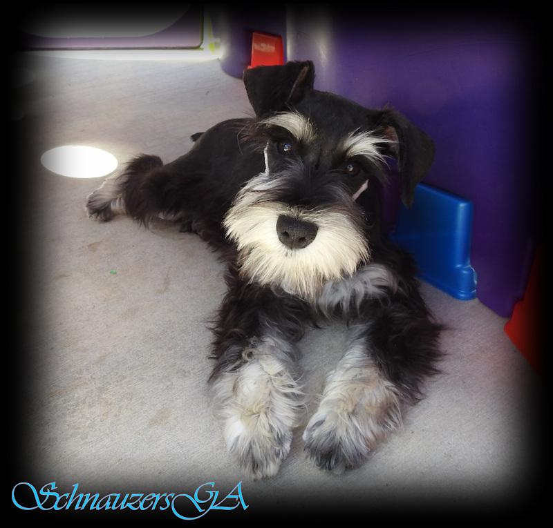 Our puppies include salt and pepper, black and silver, and black. Colors will vary depending on the parent dogs.