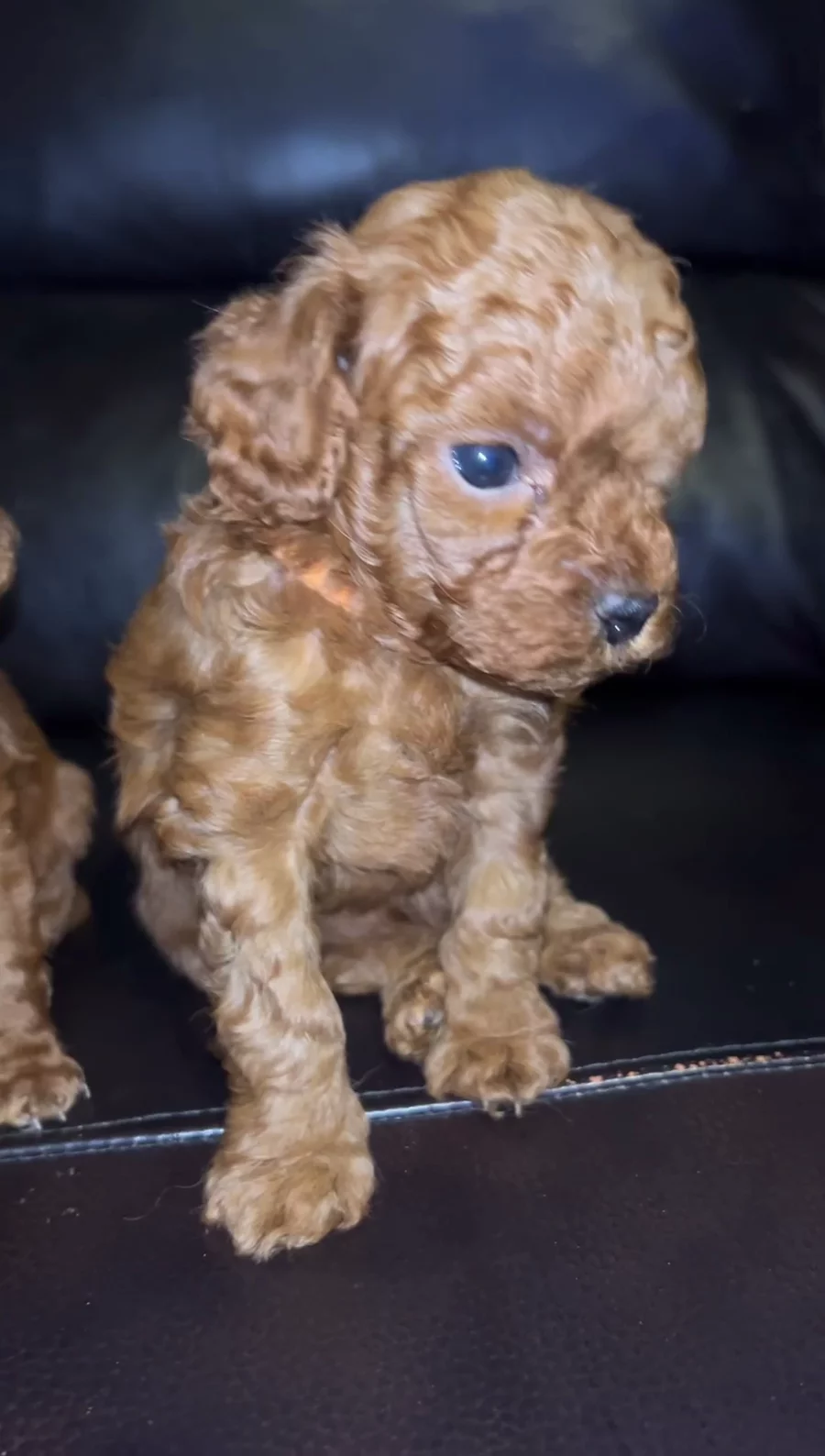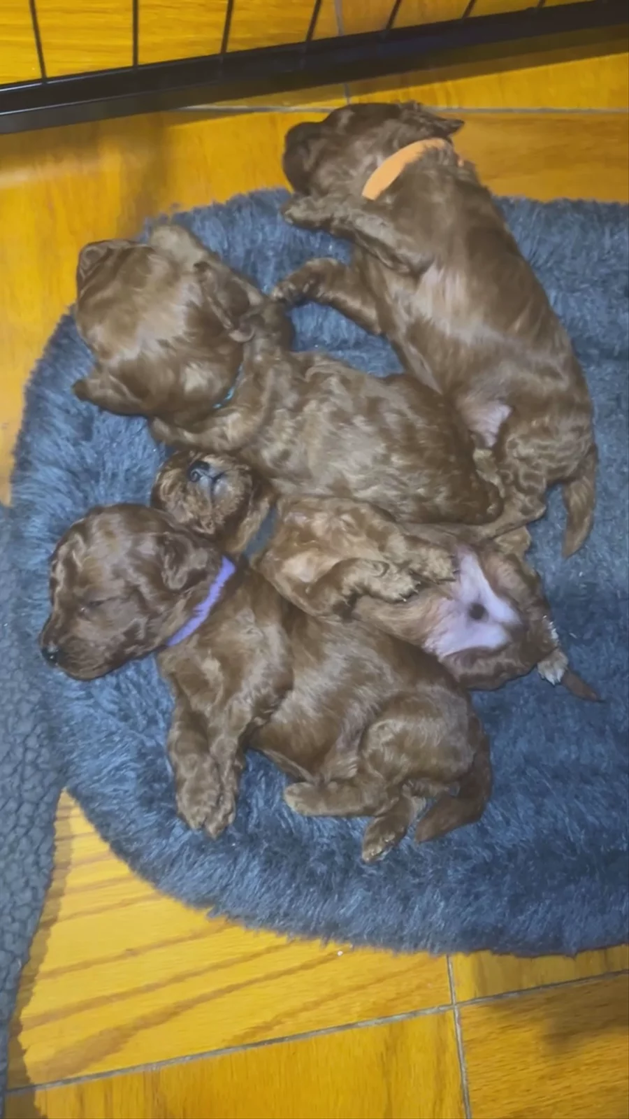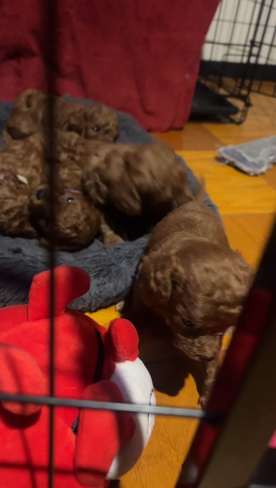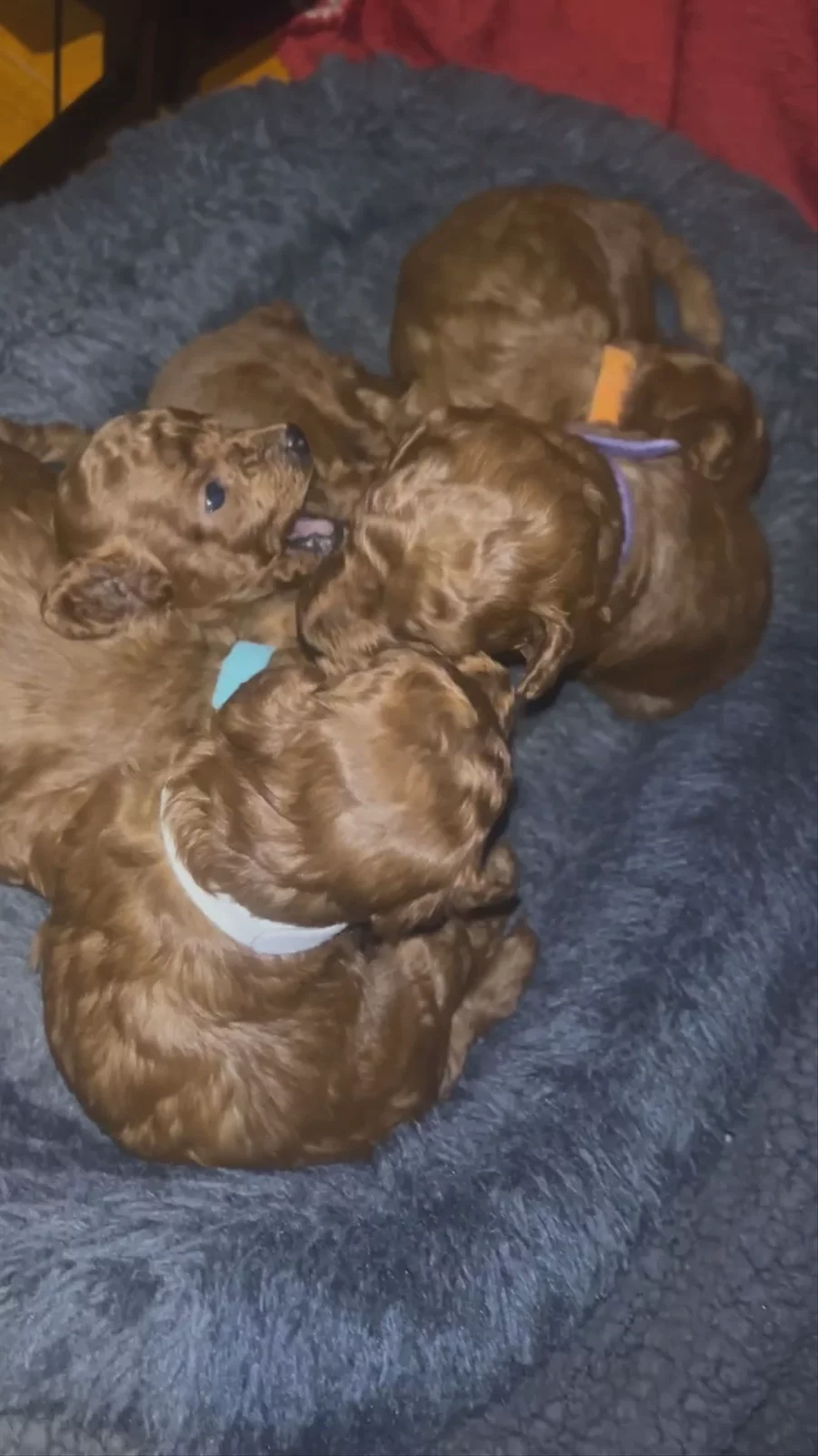 Our Pomeranian puppies include blue merle and black and tan. Poodle puppies are red. Colors will vary depending on the parent dogs.