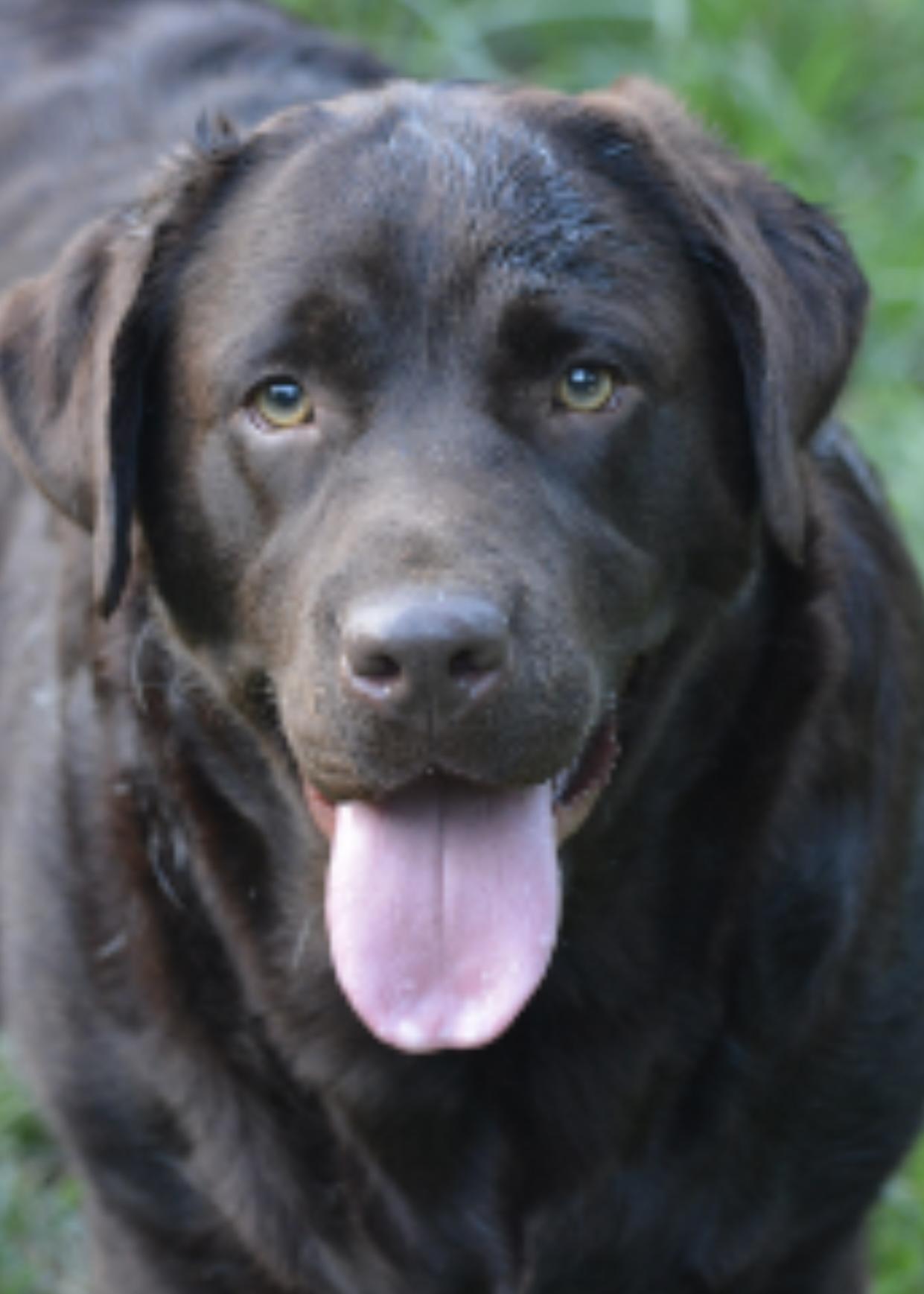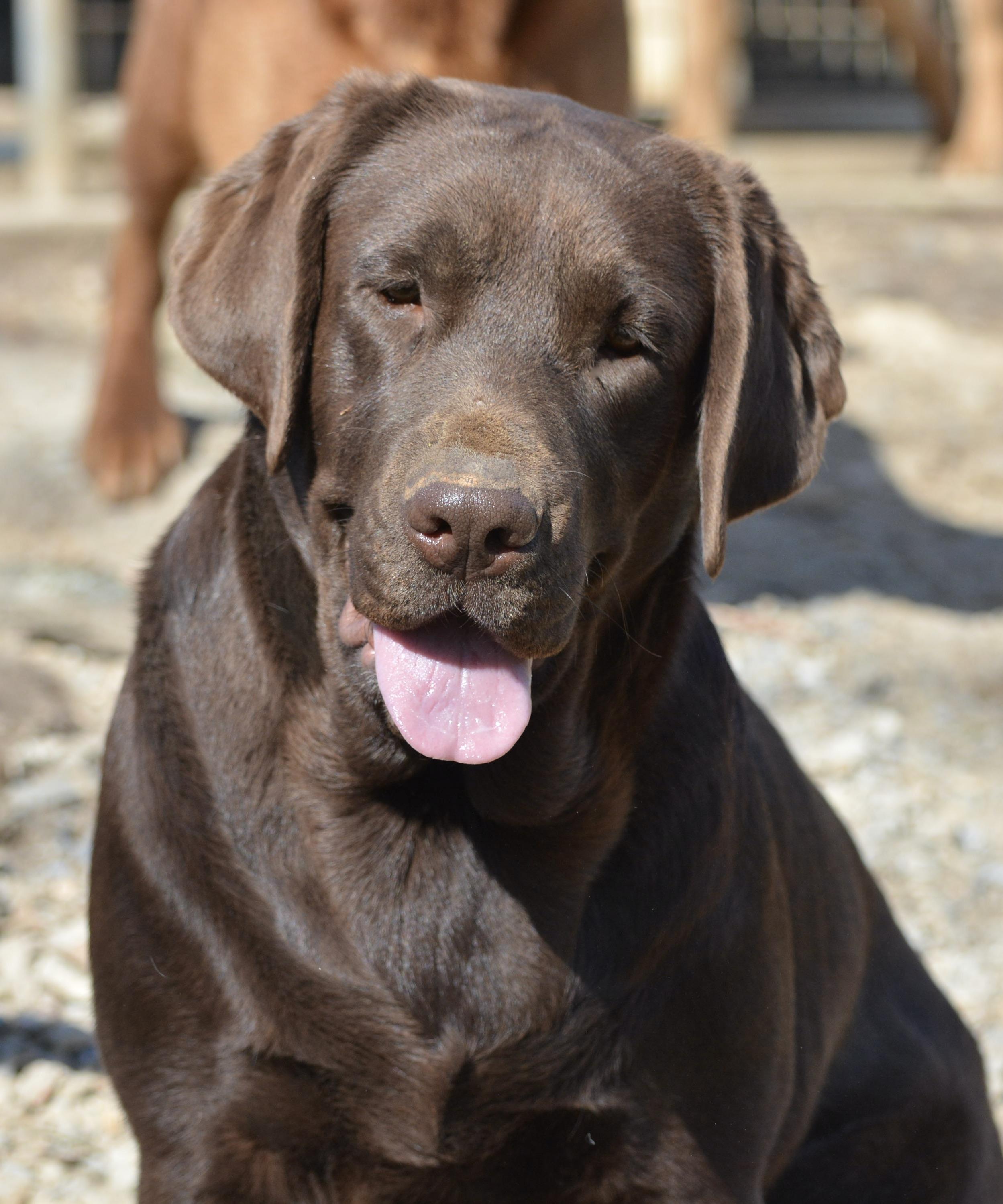 Rosie is a big beautiful chocolate female with a square head with parallel planes, correct coat, and otter tail. She is super friendly and gets along with kids and cats. She loves attention from anyone that will give it to her. She loves to eat and is always finding ways to get you to give her a treat. She has big beautiful puppies.