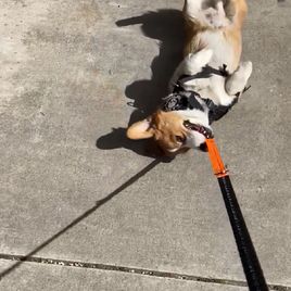 from car sickness. Si Fu has a relaxed temperament with bursts of energy; he happily "sploots" and becomes playful when he prefers not to walk. He typically engages in three 15-minute walks a day, two 15-minute play sessions of fetch, and a 5-minute trick training session, which aligns with his preferred exercise routine.
