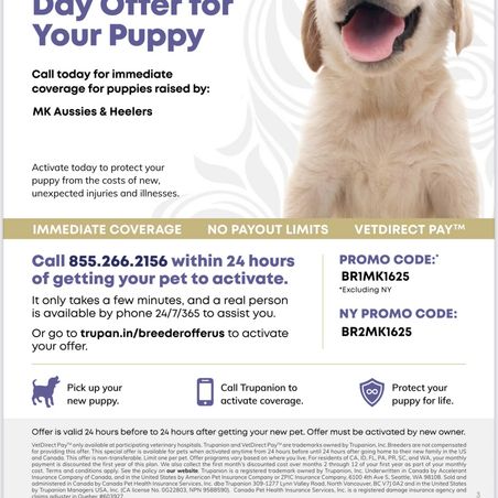 “All Puppies come with a Health Guarantee, 30days of free pet insurance, gift bag ( includes: food, treats, toys, puppy pads, NuVet supplements) UTD on shots/wormer, Started on potty training, crate training & basic commands. Deposits will be deducted from total asking price, this will hold your puppy of choice till pickup. Deposits are non refundable but can be transferred to another litter or puppy per request.”