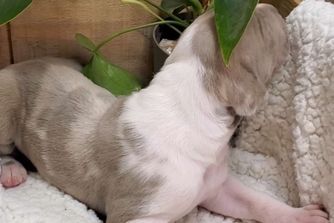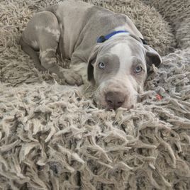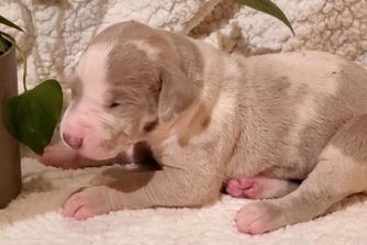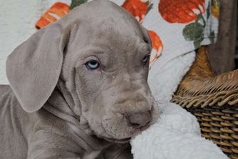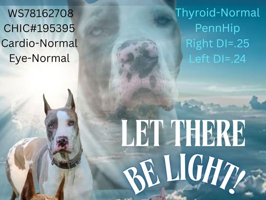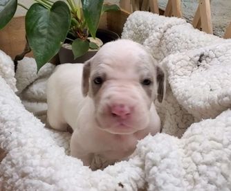 Vienna is a gorgeous lilac harlequin. She's smart, fun, quirky and athletic. Always seeking direction and approval. Loves to fetch and be silly. She weighs in at 120 lbs and stands 33 inches at the withers. She's had all of her testing completed and is certified. Strong hips on this girl. This is a repeat pairing since the last litter was so beautiful!