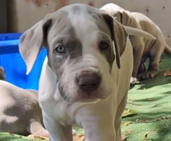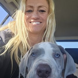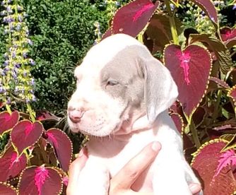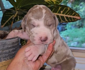 Stunning lilac (silver) harlequin. Weights in at 120 lbs and 33" at the withers. Fully OFA health tested with great hips, tight blue eyes and jowels. She loves her daily runs in the woods and seeks direction and approval. Loves to play catch, give hugs, getting her belly rubs and being silly. This is her second litter with the same sire as her previous pups were gorgeous!