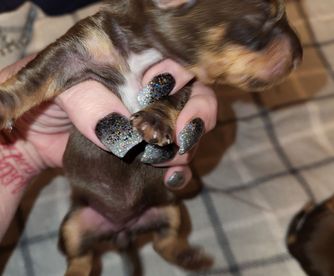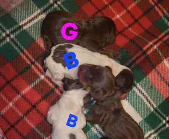 Our puppies include piebald, chocolate and cream, black and tan, chocolate and tan, and dapple. Colors will vary depending on the parent dogs.