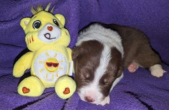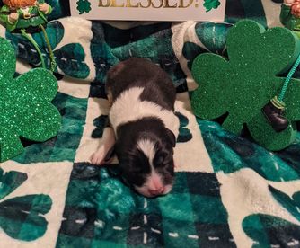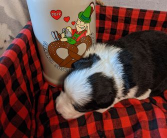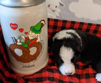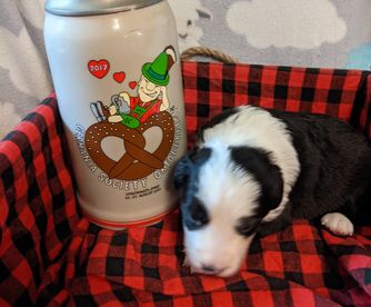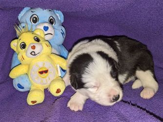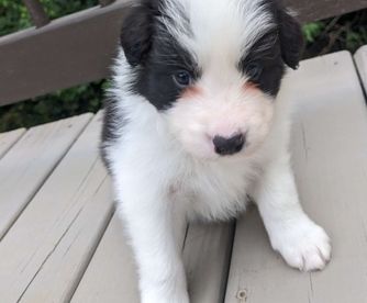 Our American Eskimo Dog puppies are white. Border Collie puppies include tri-color, black, and red. Colors will vary depending on the parent dogs.
