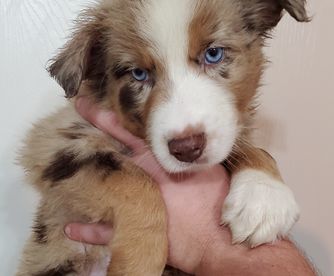 Our puppies include red merle and blue merle. Colors will vary depending on the parent dogs.