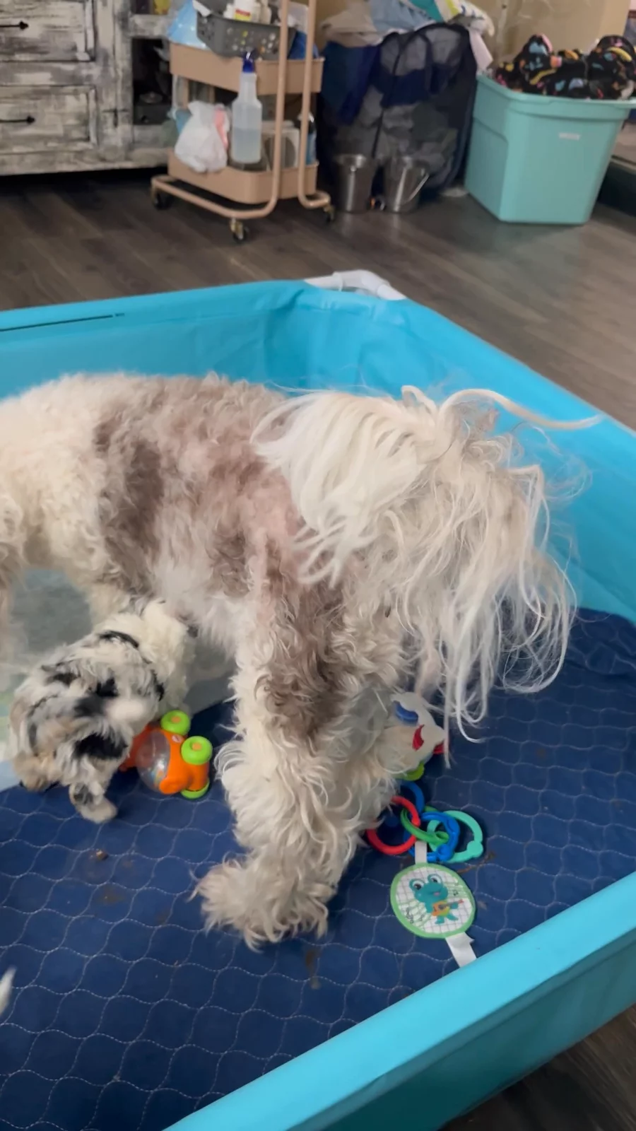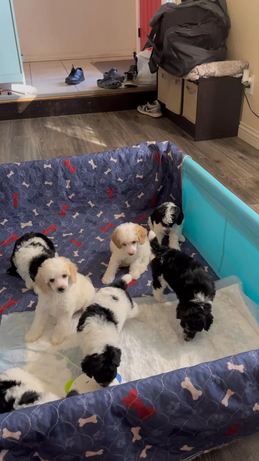 We do a wonderful puppy program with all of our puppies. We start potty training at three weeks old and they do very well. We also crate train and do lots of sensory skills and development skills. They are raised with my children and our home. We do all of the normal things that any puppy would do with the family.