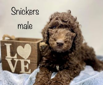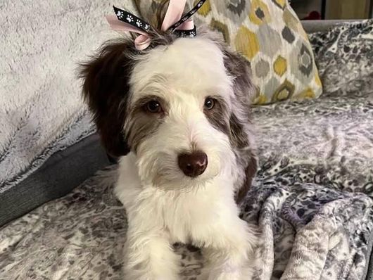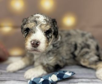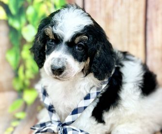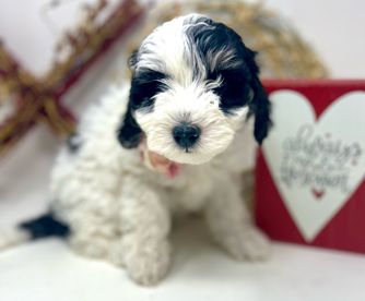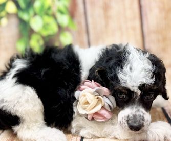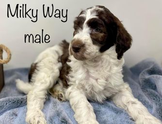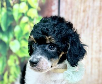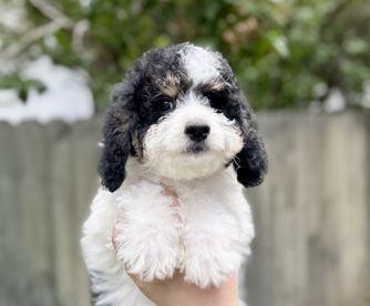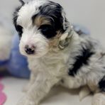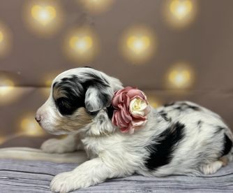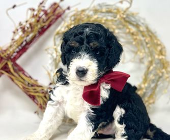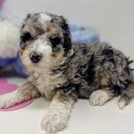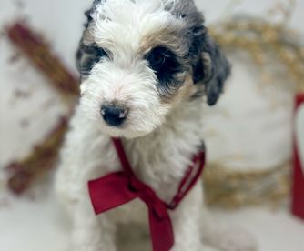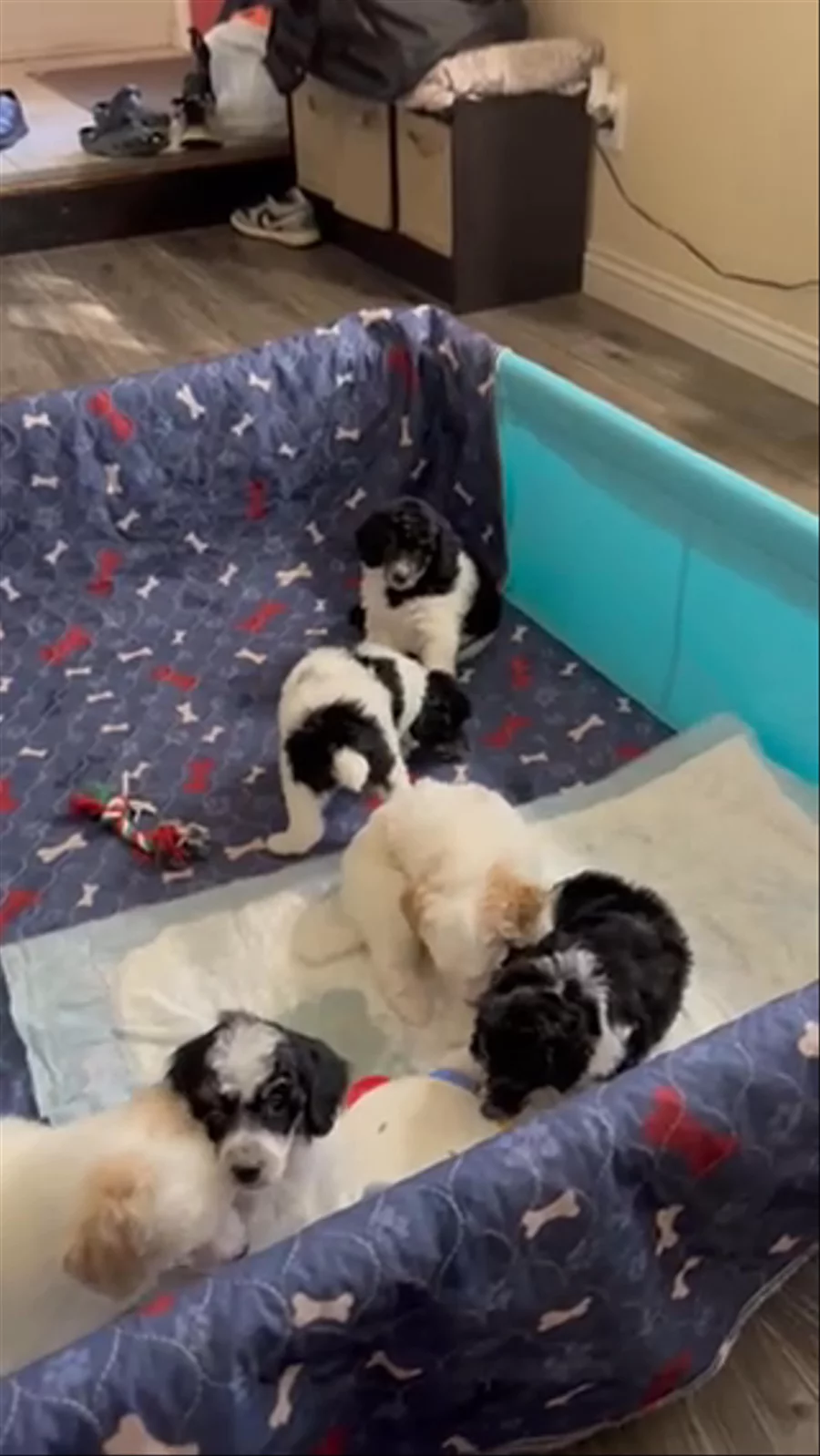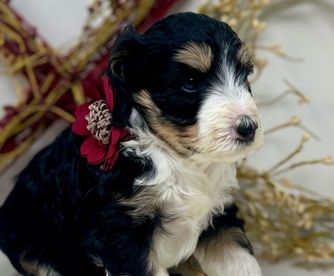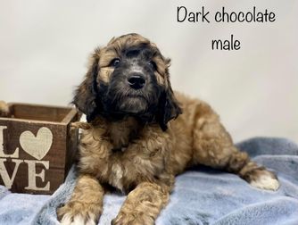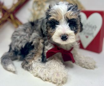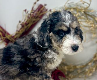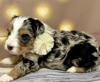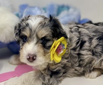 Our Labradoodle puppies include chocolate and tri-color. Aussiedoodle puppies include blue merle, black phantom, and black and white. Colors will vary depending on the parent dogs.