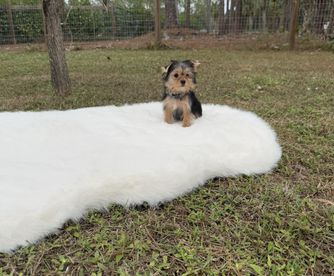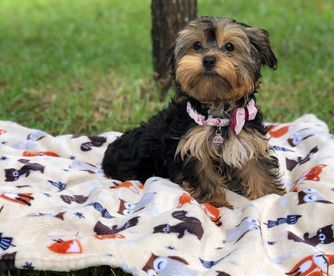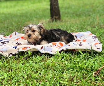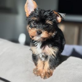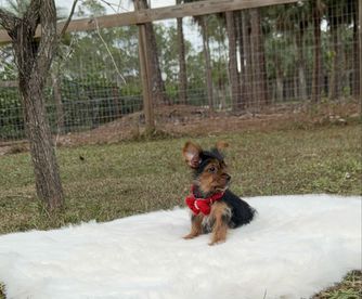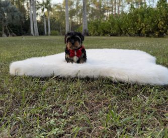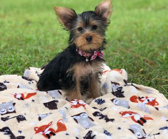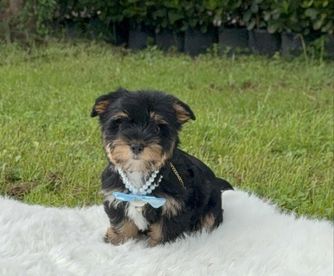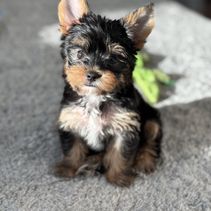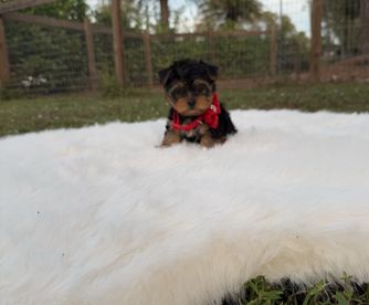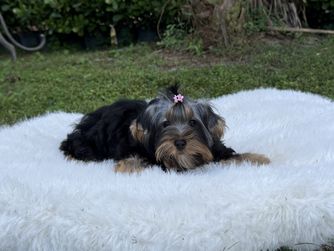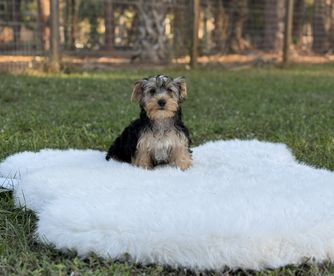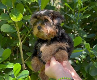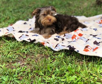 Yorkshire Terrier puppies include chocolate and tan and blue and gold. Colors will vary depending on the parent dogs.