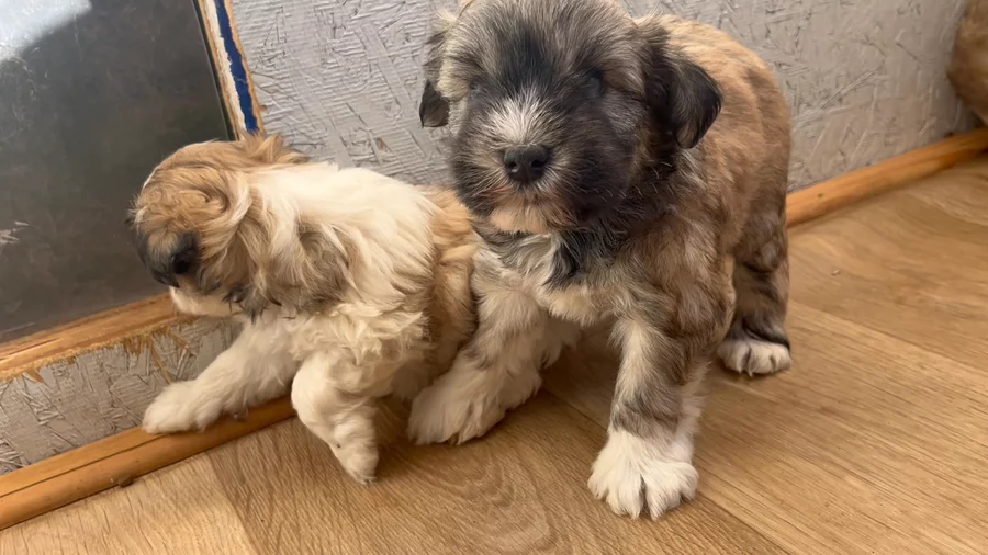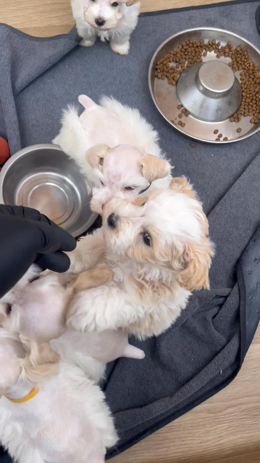 These beautiful wheaten parti pups are one month old and doing GREAT! So cute. Getting active! I’m so in love! 😍