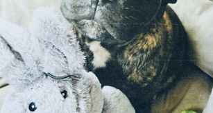Darby is an AKC Grand Champion Bronze standing 15 1/2 inches tall and her typical weight is 34 pounds. She's a beautiful brindle and white, sweet as pie, playful and funny! She is 5 years old, and this is her third and final litter. She loves going to the shows ( and being a showgirl) and we look forward to doing more AKC competitions this year including nose work.. and FASTCAT!
