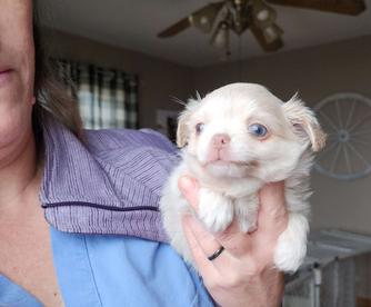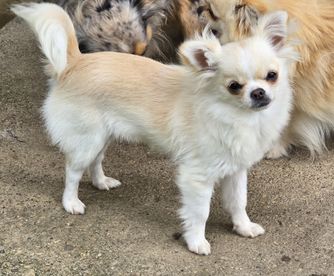 Tater is an energetic sweet loving long coat chihuahua. She is AKC and DNA/health tested clear. Tater is one of my favorites. Her personality is quirky and goofy. My kids love Tator!