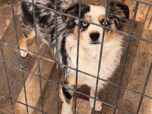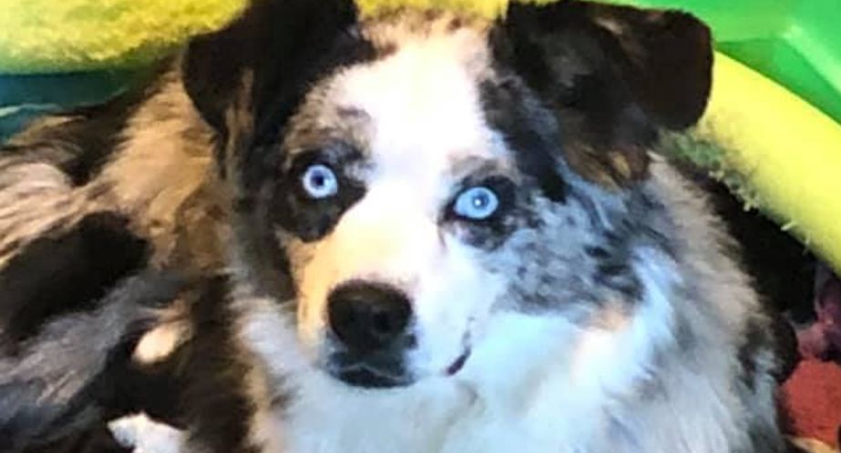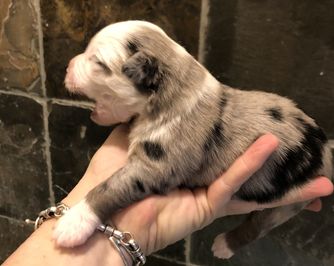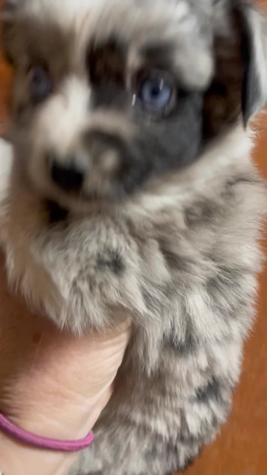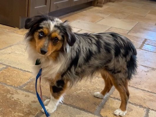 Blue merle with two blue eyes. 15” and the happiest girl! She’s a smiler
