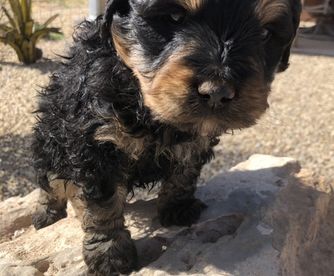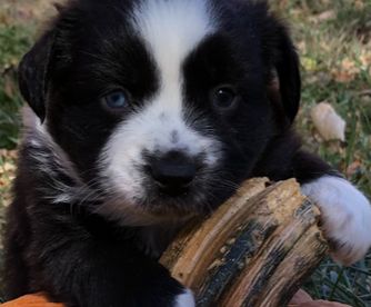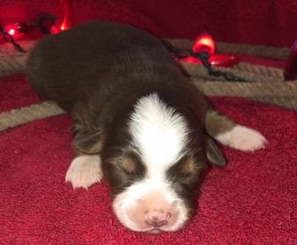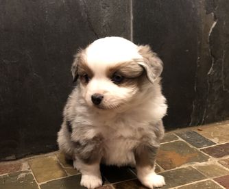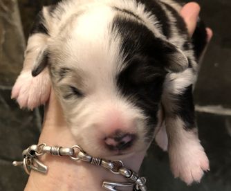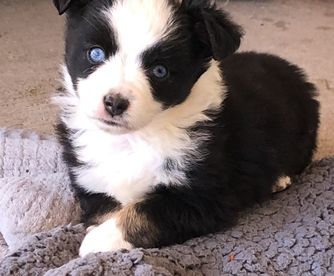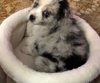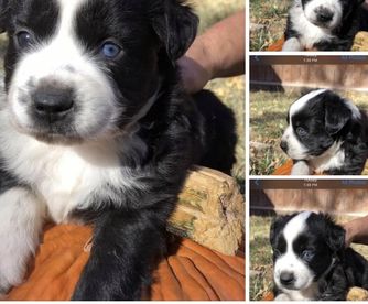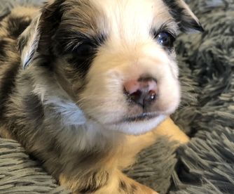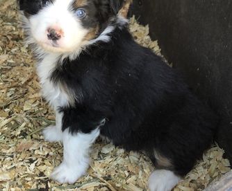 Our Aussiedoodle puppies include blue merle and black and white. Toy Australian Shepherd puppies include black & white, black tri, blue merle, and red merle. Colors will vary depending on the parent dogs.