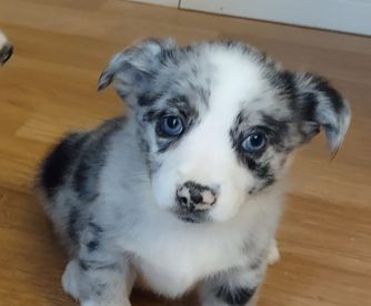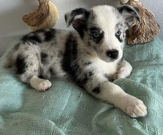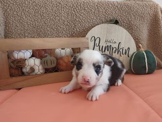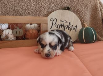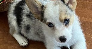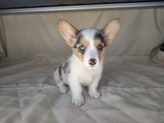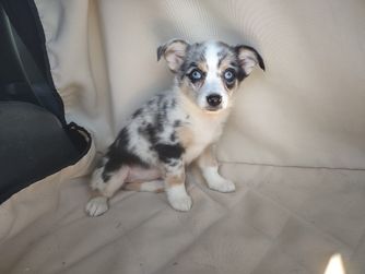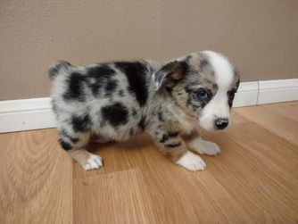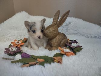 Balue is our purebred CKC registered blue merle american corgi with 2 stunning blue eyes! She is daughter to sky & dumbo and she inherited both their wonderful personalities. She is a super sweet playful pup and she will be added to our breeding program once old enough.