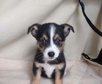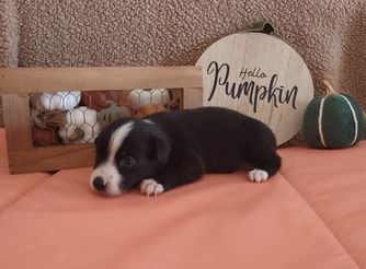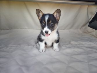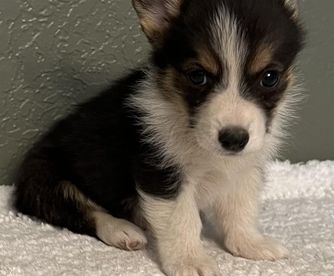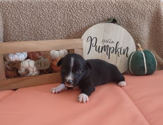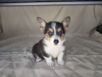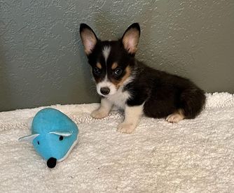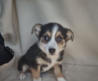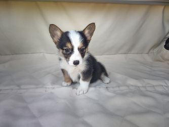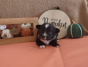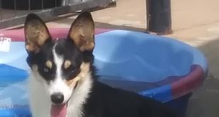 Sky is our purebred CKC registered black tri pembroke welsh corgi who has the most beautiful blue eye! She is the sweetest girl who loves playing and cooling off in the water on hot days. She is a wonderful mama who has given us some stunning babies.
