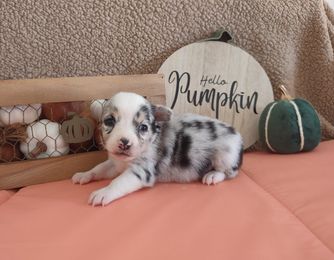 Dumbo is our CKC registered blue merle american corgi. He has the most outgoing personality and we often catch him cooling off in the water on hot days. He is available for stud service to approved outside females.
