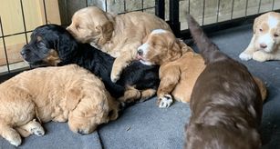 Our Goldendoodle puppies include apricot, chocolate, black, phantom, and parti. Poodle puppies include apricot, black, brown, parti, and phantom. Colors will vary depending on the parent dogs.