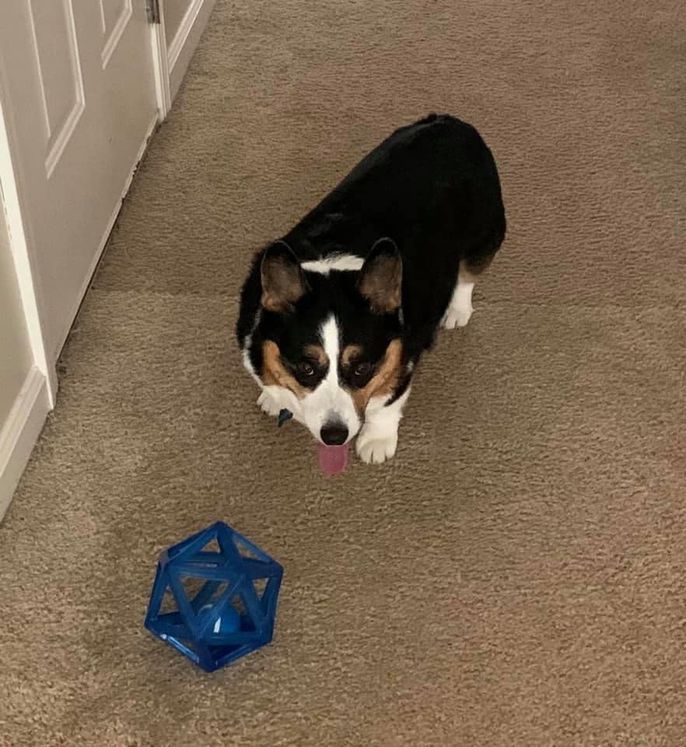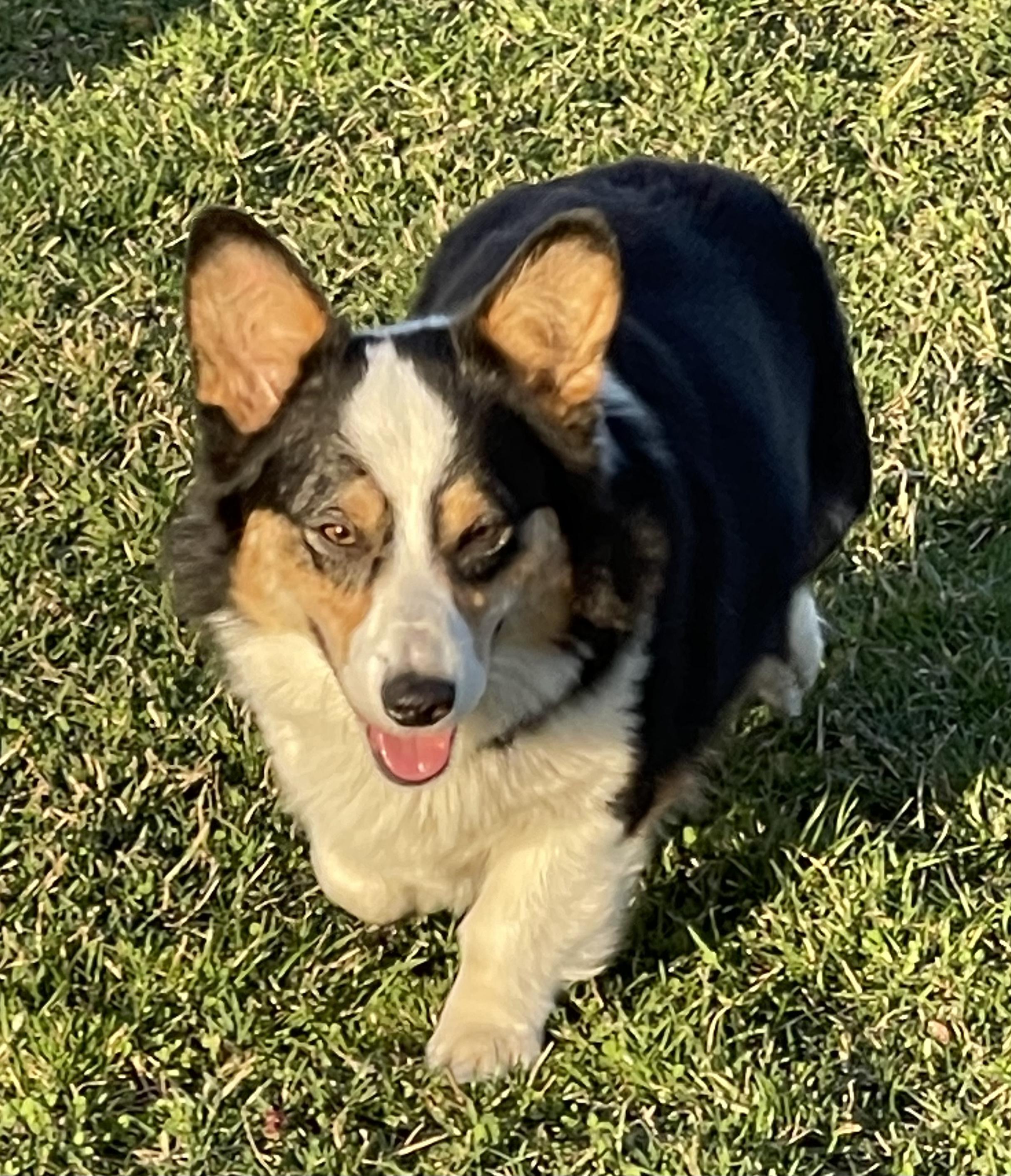 Ashes is a beautiful brindle pointed black tri American corgi. She is my most active momma and loves to go on walks and will jog with me around the farm. Super personality, loves everyone.