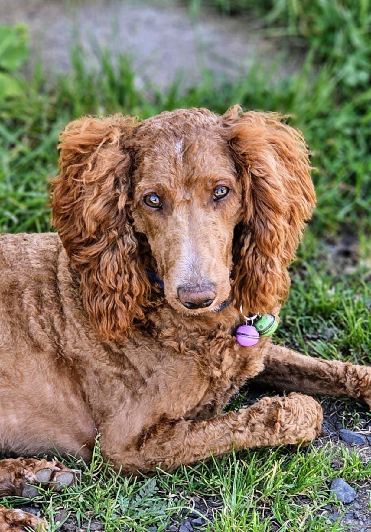 Our female, Lola, is a purebred Moyen Poodle with a rich chestnut coat and soulful, deep brown eyes. She’s playful, curious, and full of joy — a loyal pack member with a smart, loving personality.