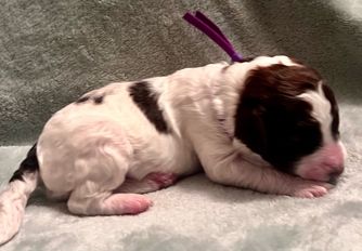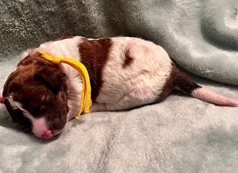 Marlee is a precious girl. She has a very gentle demeanor. She enjoys laying with her family and going to work with her mom at church. She gets to welcome guest as they come in the door. This is Marlee’s first litter and she has been an excellent mom.