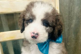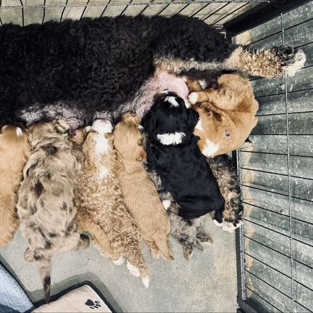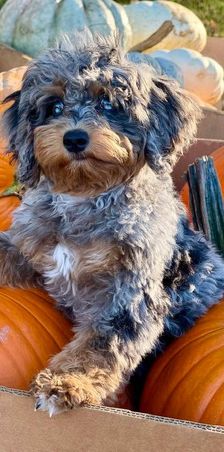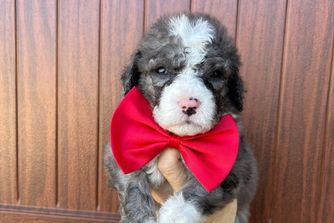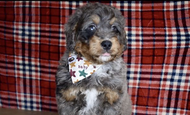 Our Goldendoodle puppies include cream, apricot, red, chocolate, merle, and parti. Bernedoodle puppies include sable, black, black and white, tri-color, phantom, and merle. Colors will vary depending on the parent dogs.