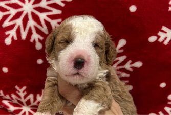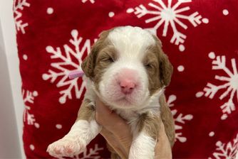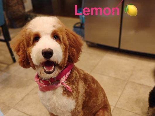 Lemon has such a sweet temperament. She is a beautiful tuxedo, red and white Bernidoodle. All of her puppies will be just as gentle, loving and sweet as she is.