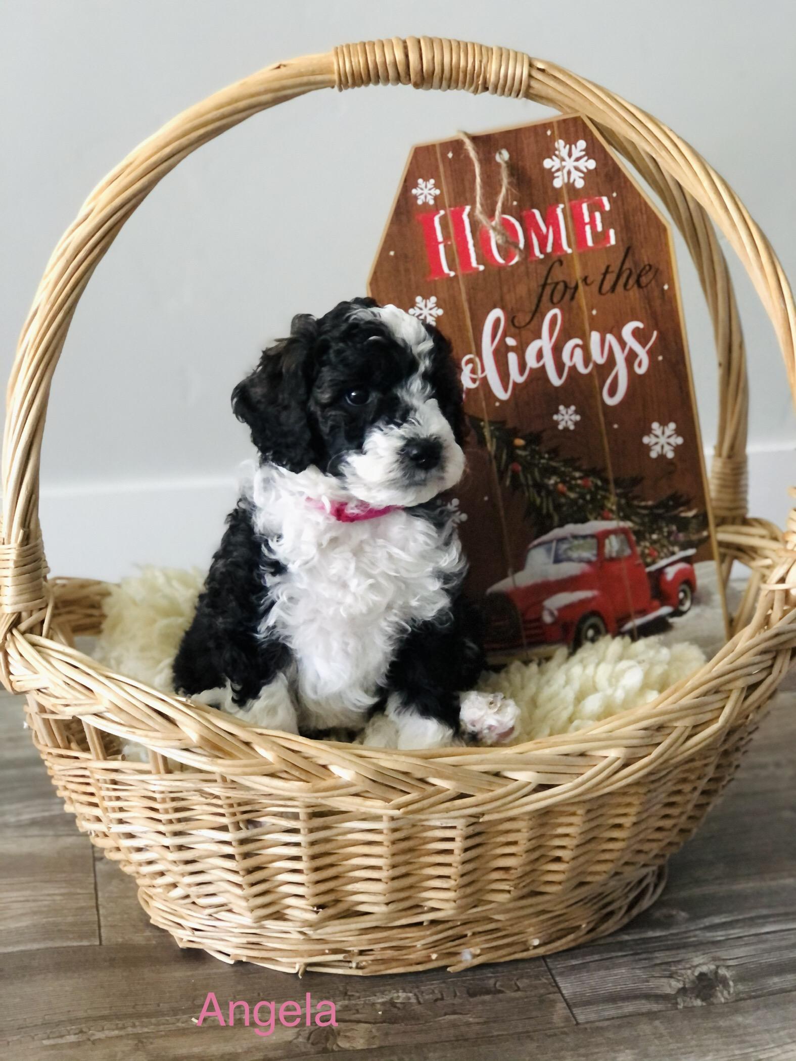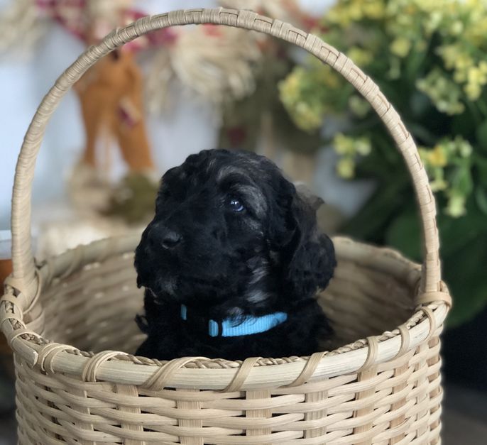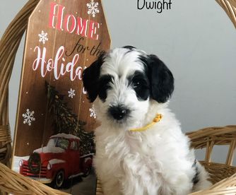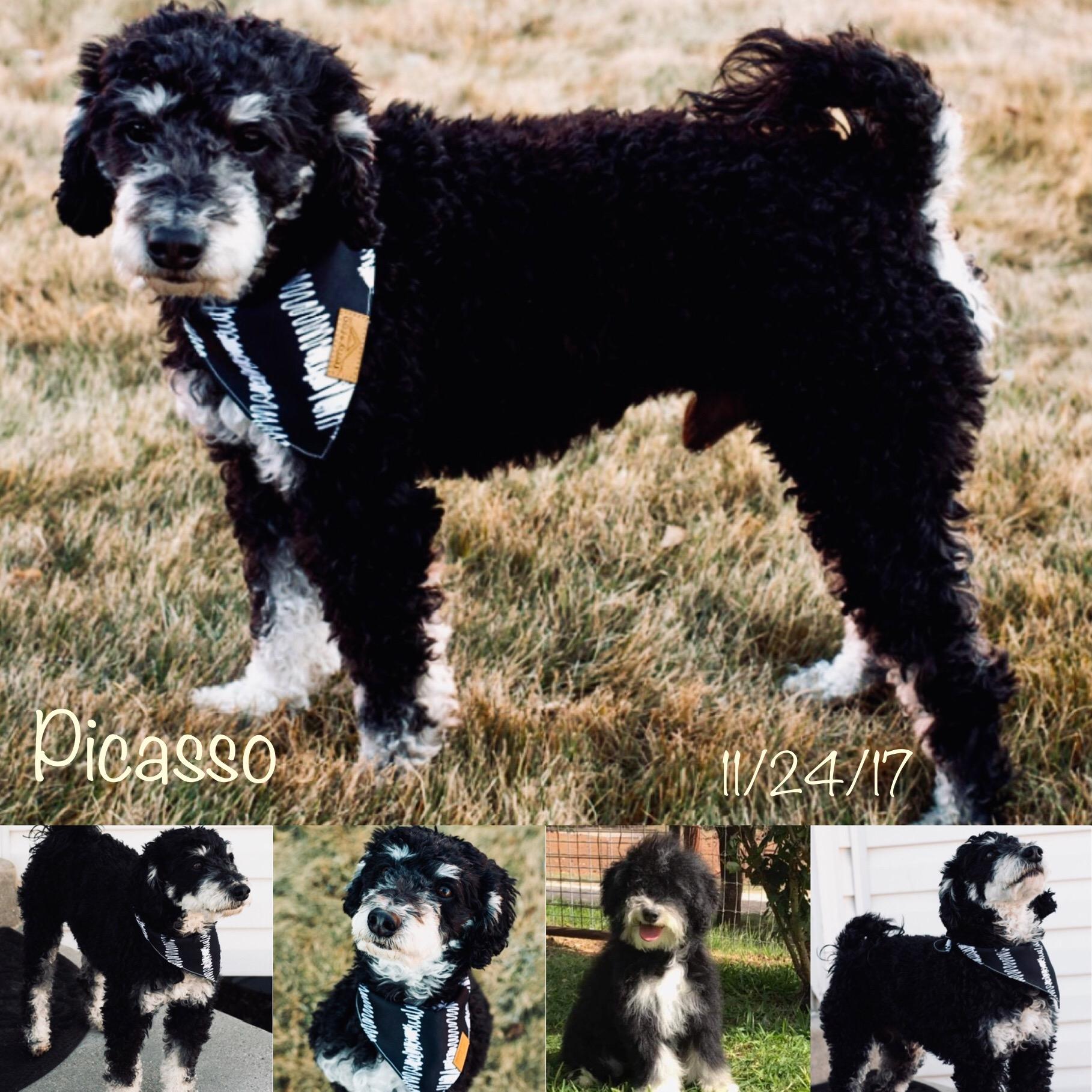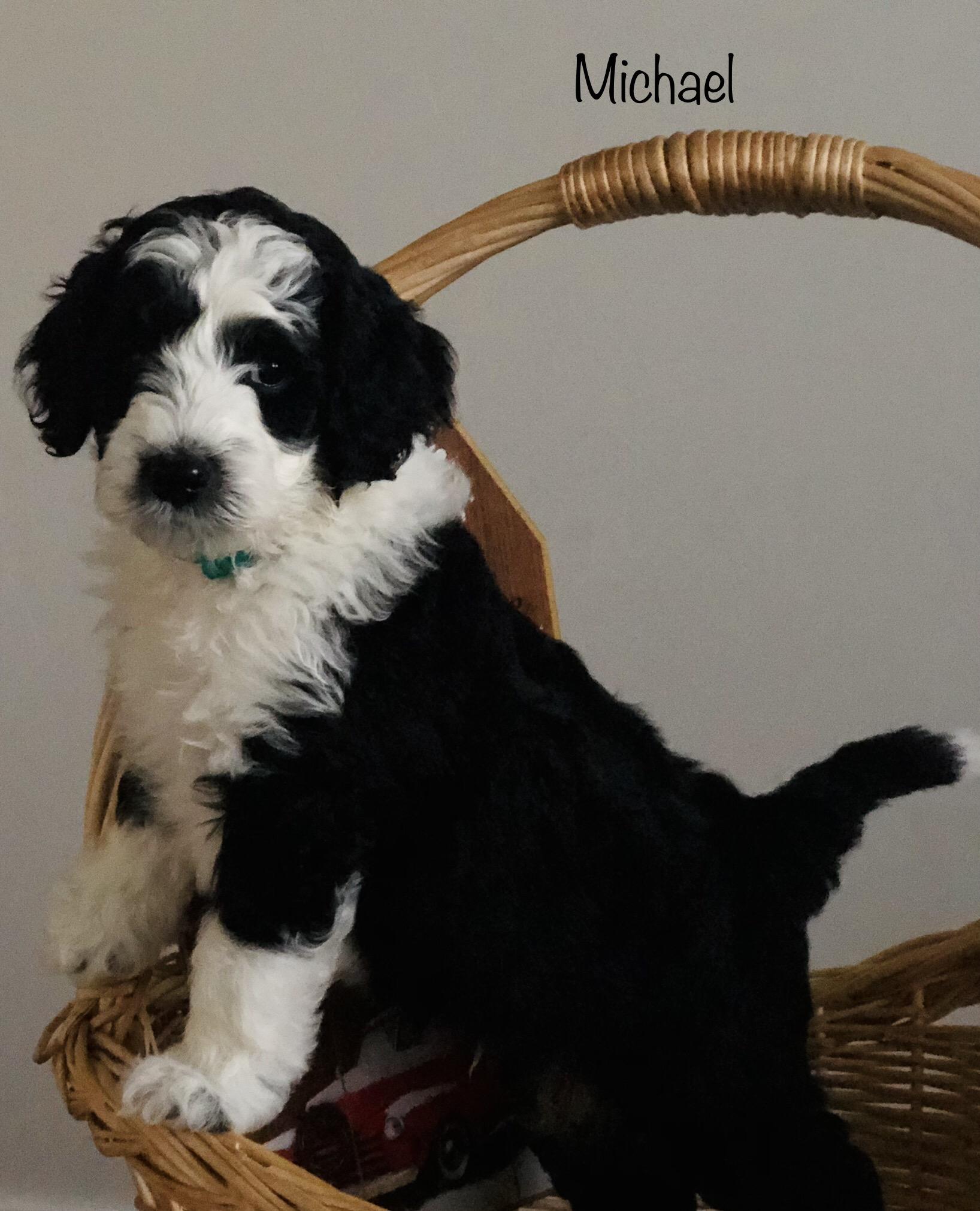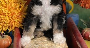 Aussiedoodle puppies include black phantom, black and white, and black tri-color. Bernedoodle puppies are tri-color. Colors will vary depending on the parent dogs.